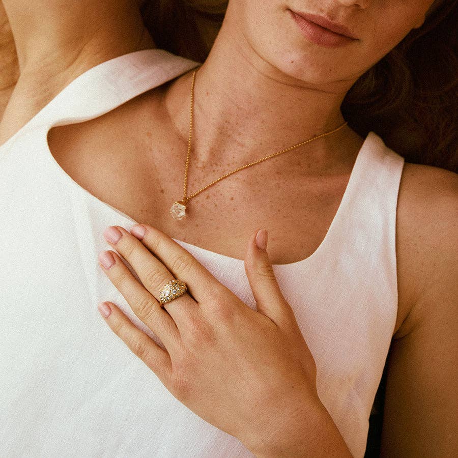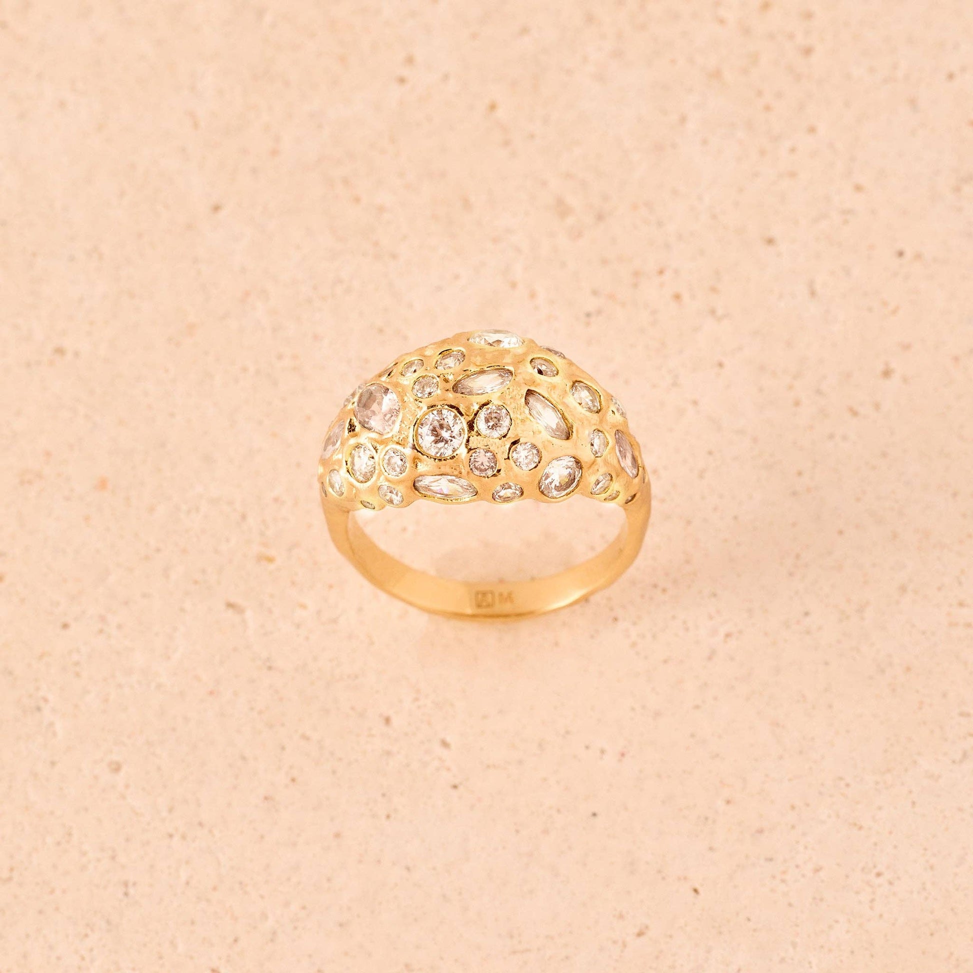 Gala is a dome ring with multiple irregularly pavé-set white stones of different sizes. A retro statement piece that blends antique charm with modern design.