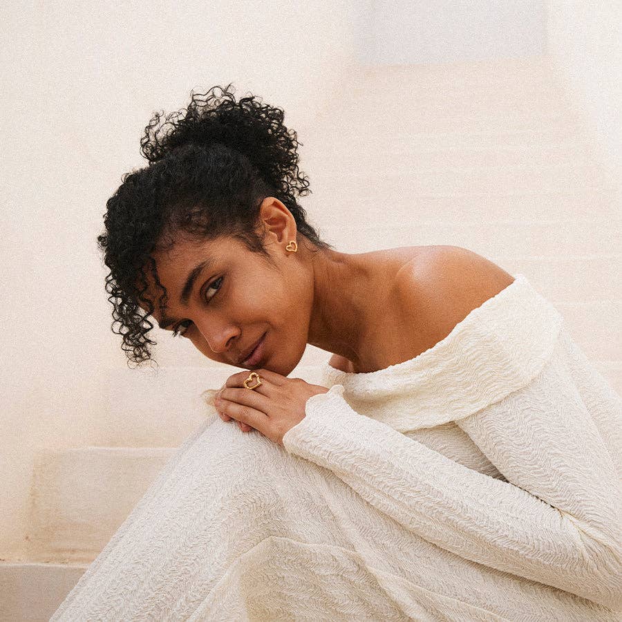 Our Liora open-heart earrings perfectly fit the earlobe, with their thick lines and minimalist design. Their irregular, empty and almost molten shape offers a modern take on the classic heart. An imperfect yet eternal symbol of love.
