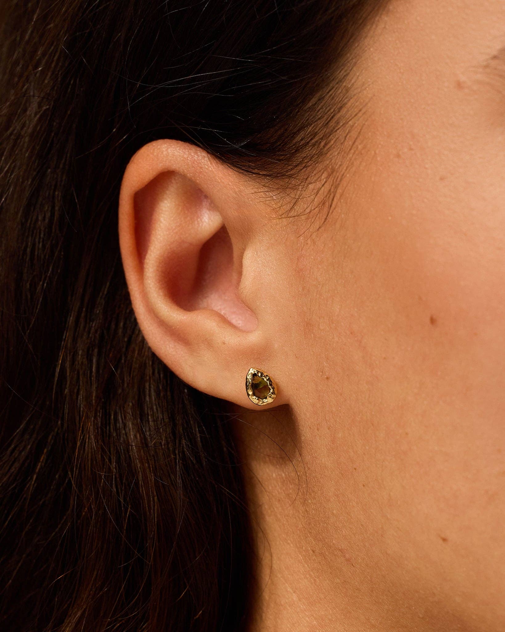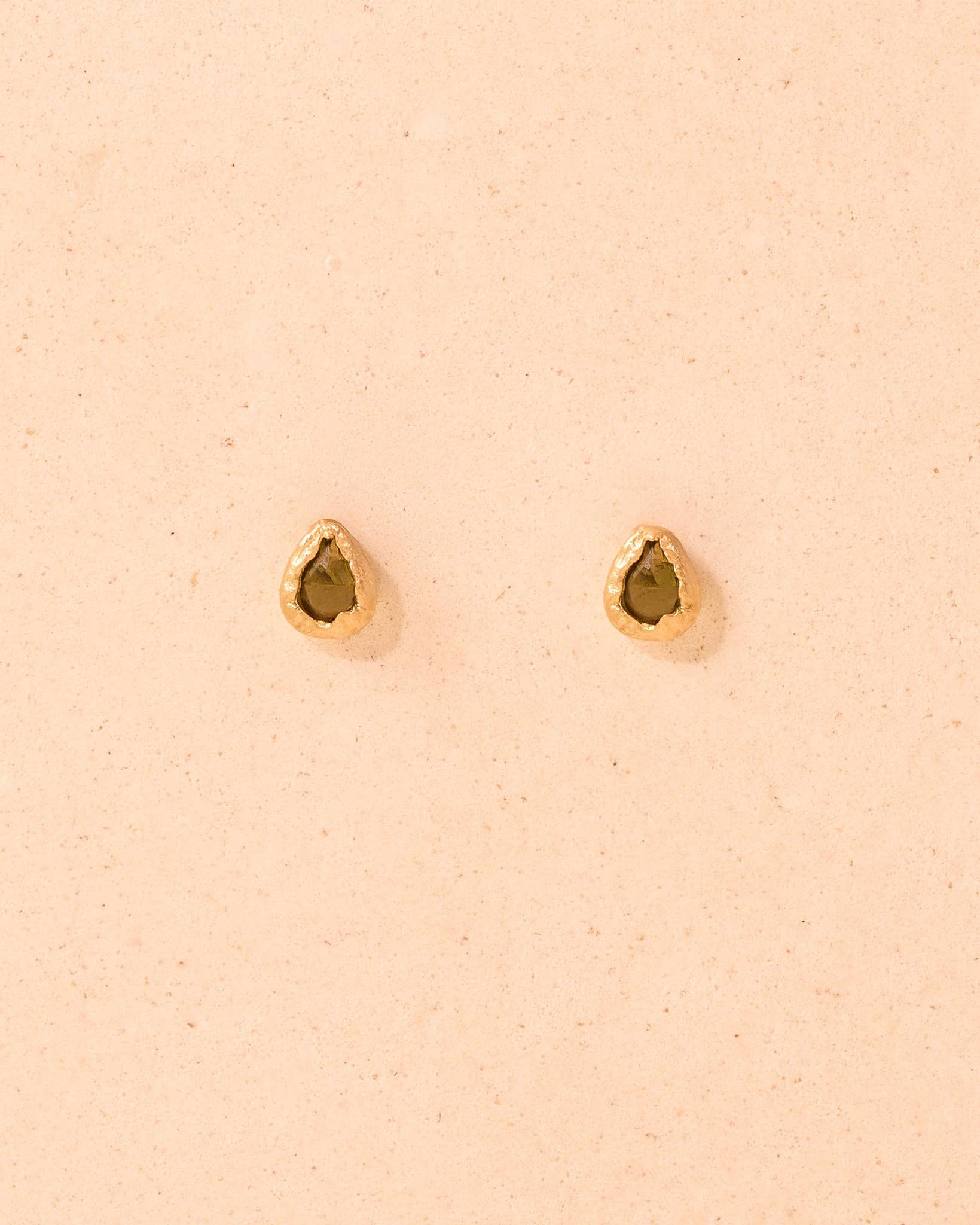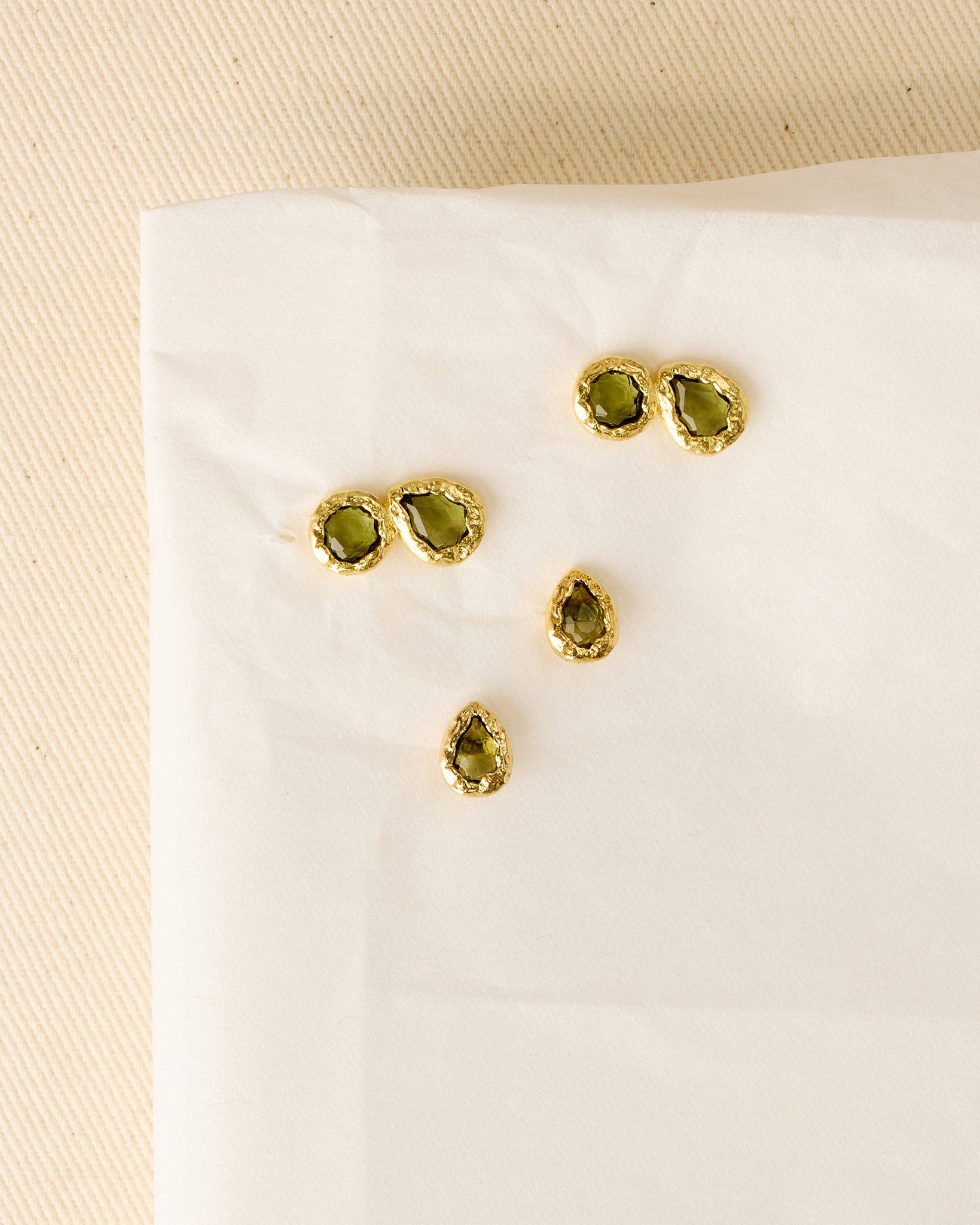 The Lysia Stud Earrings feature small drop-shaped studs, each with a dark-green stone hand-set in textured gold.