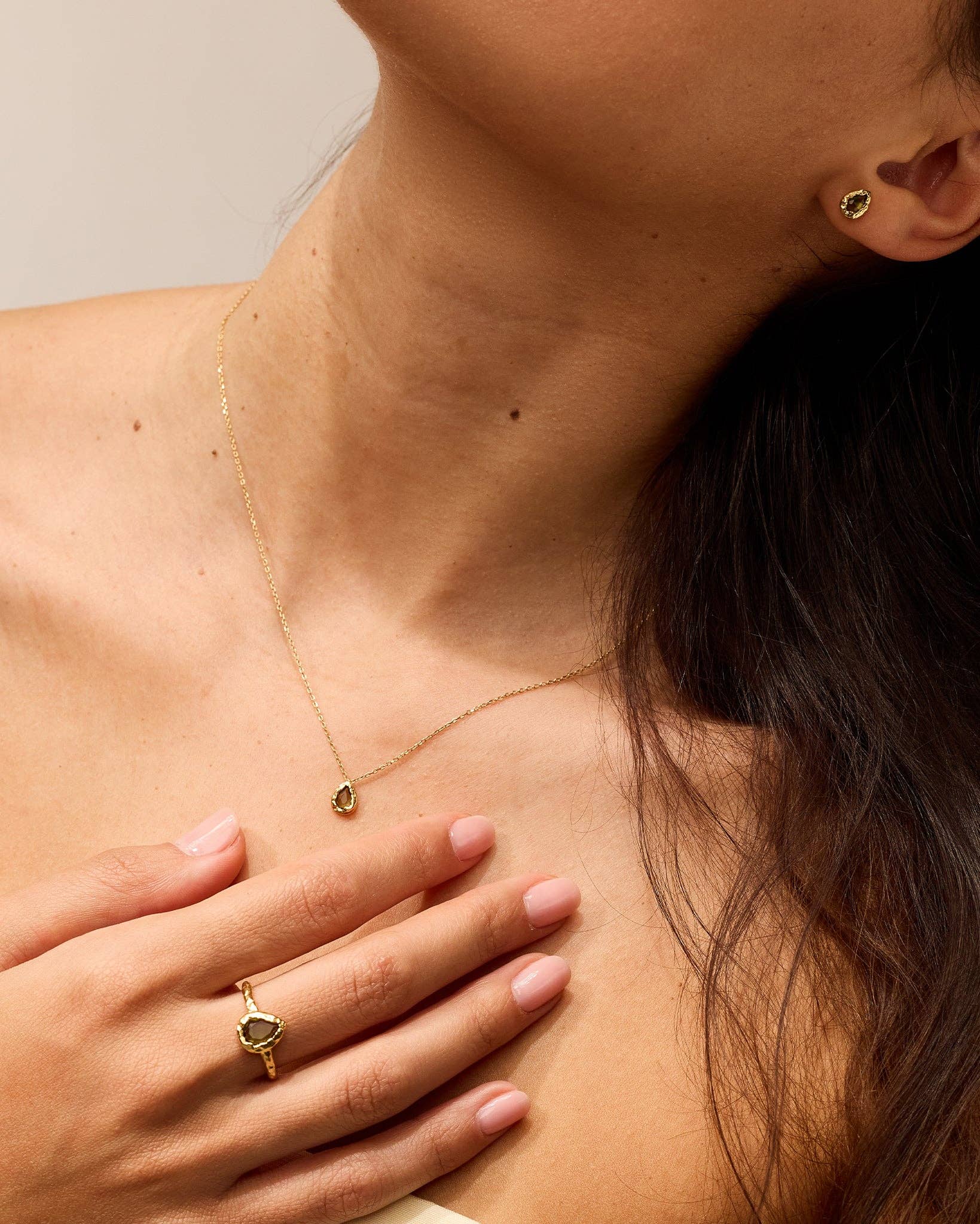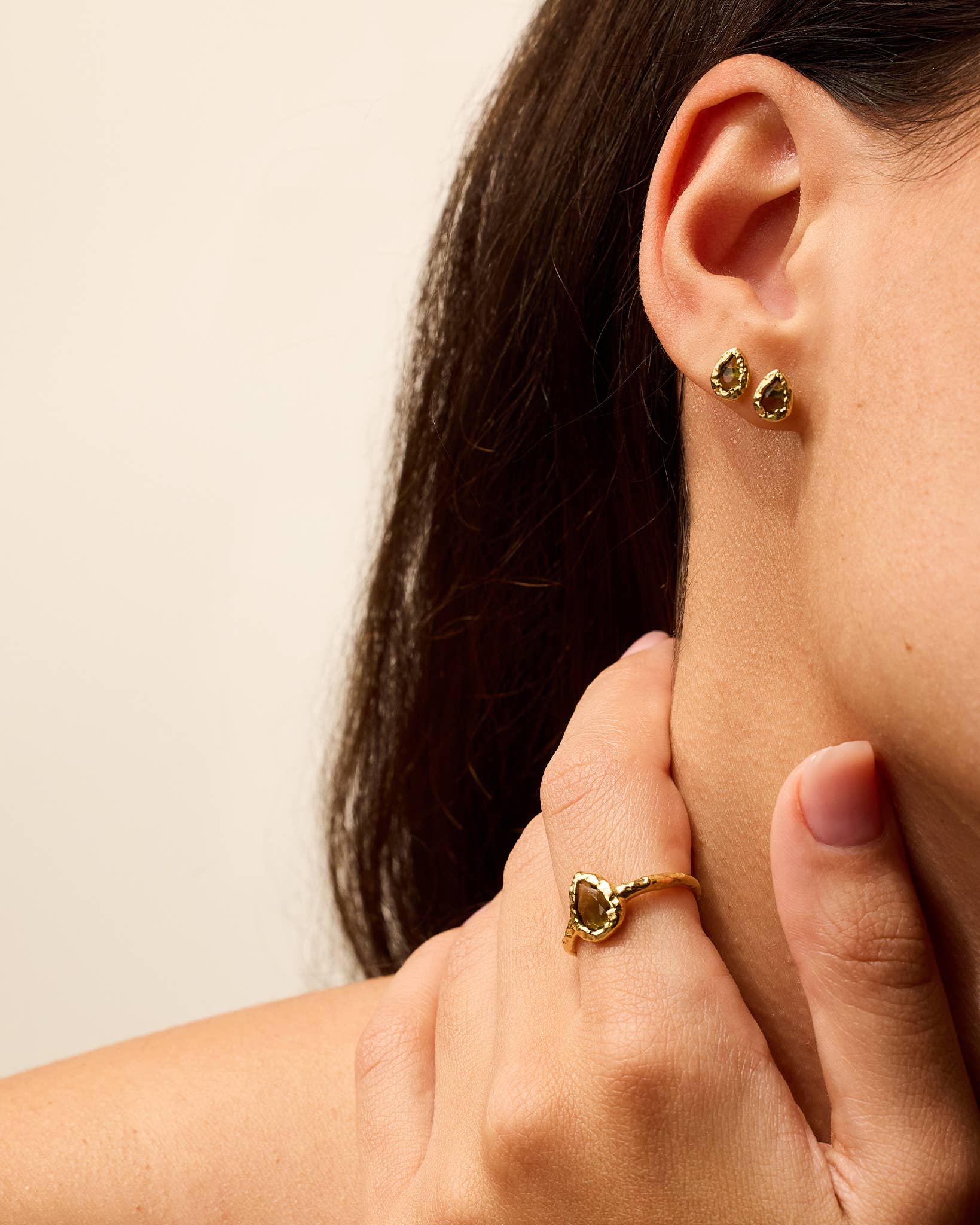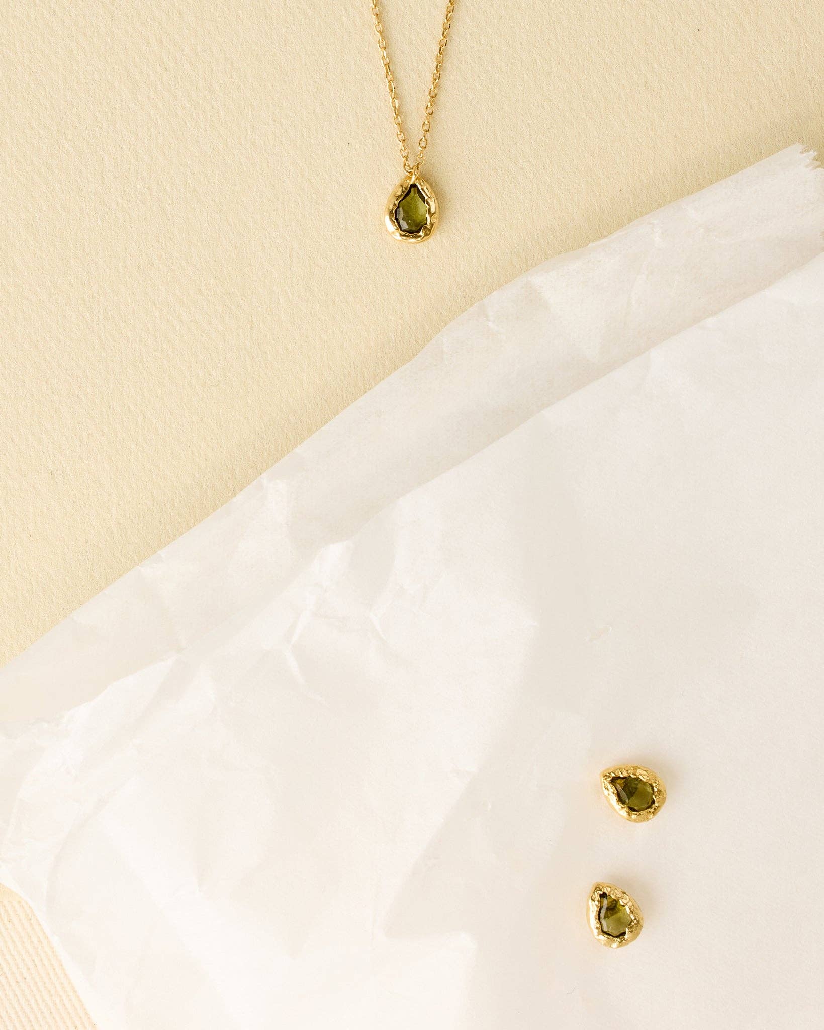 The Lysia Stud Earrings feature small drop-shaped studs, each with a dark-green stone hand-set in textured gold.