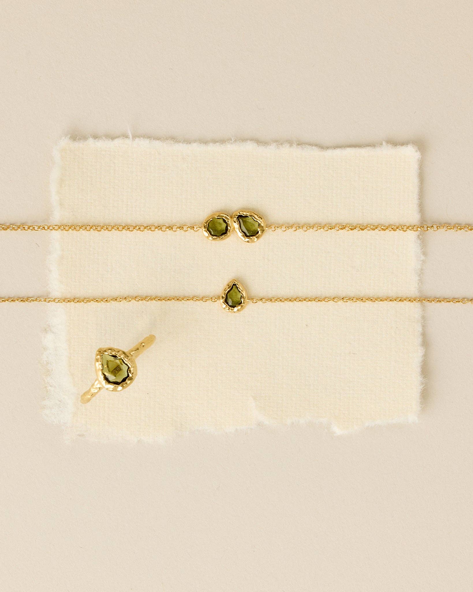The Lysiana bracelet links our signature Lysia drop with a round motif, each with a dark-green stone hand-set in textured gold.