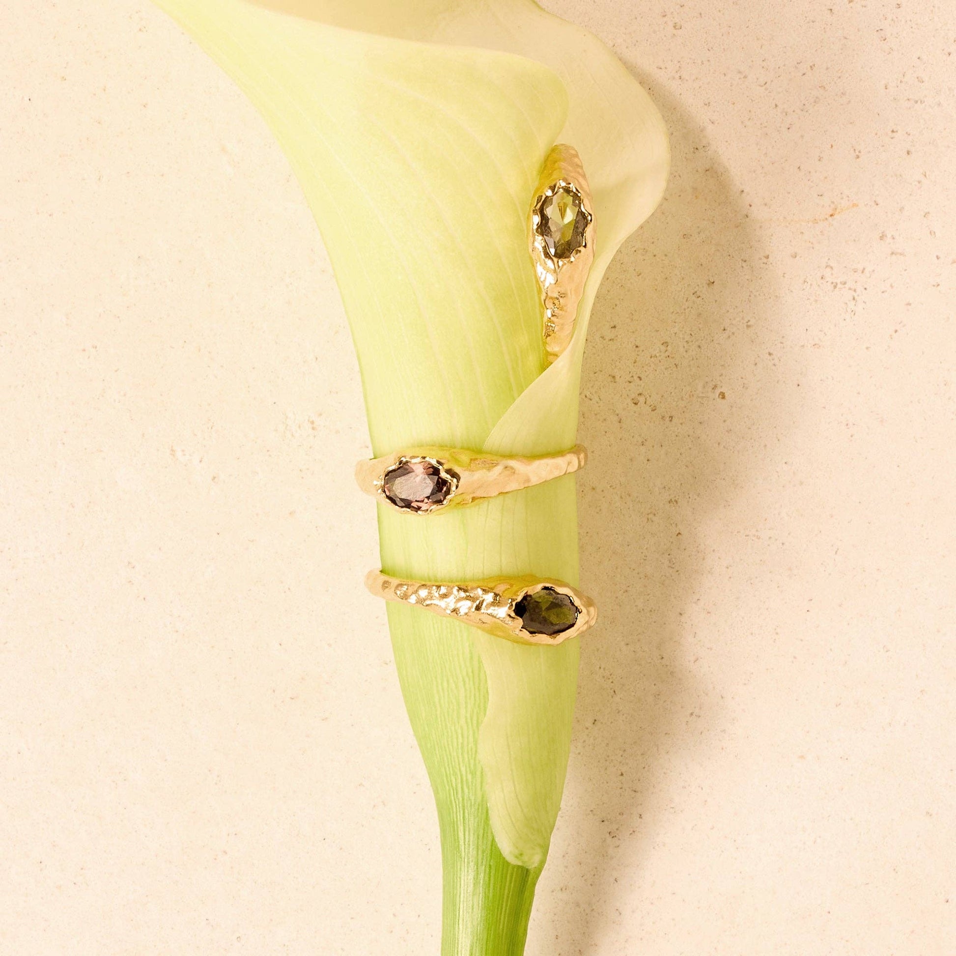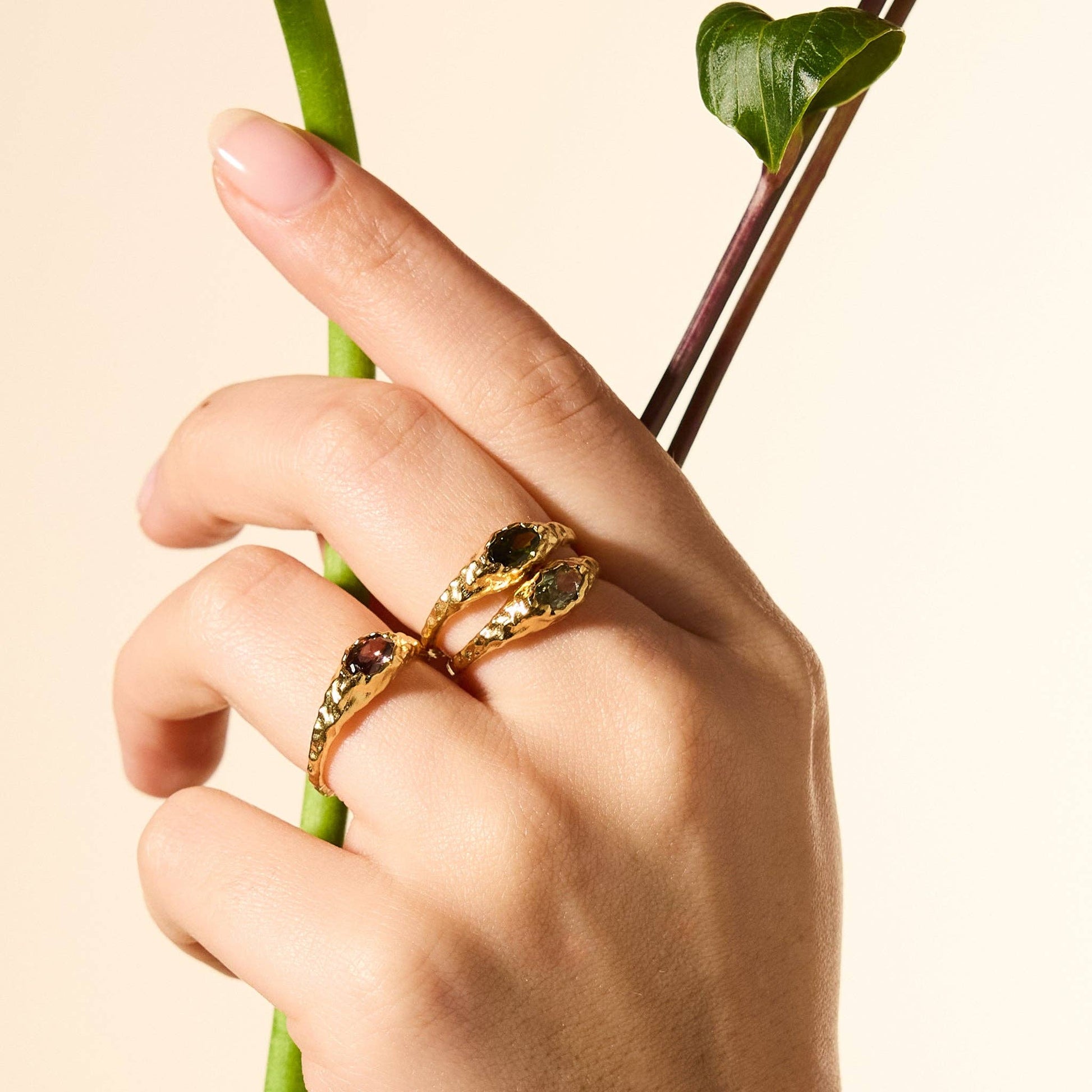 Maria Mini is a thin dome ring with a hammered surface and a faceted oval blue-green stone set into raw, textured gold. Its irregular finish highlights the contrast between metal and stone.