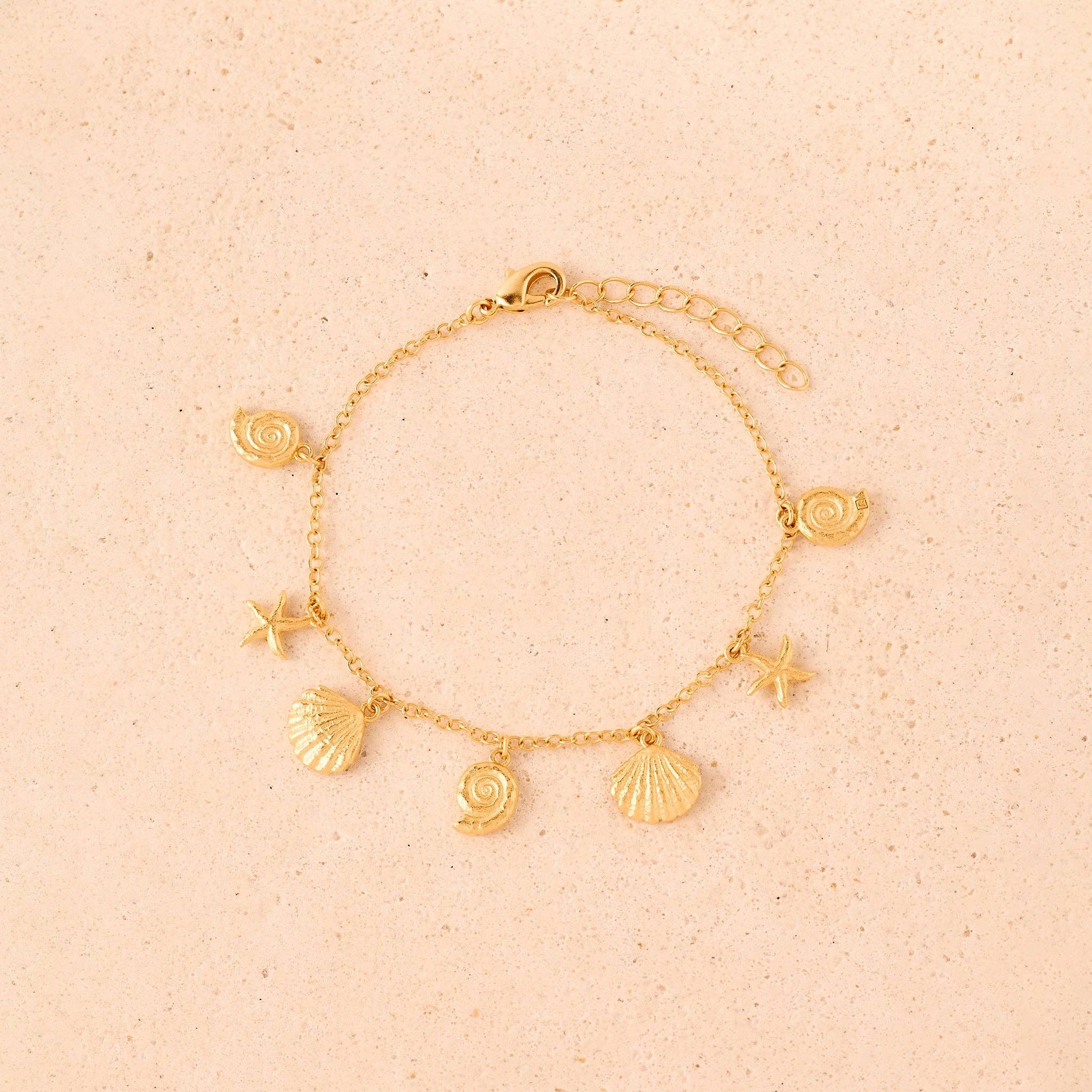 A dainty chain bracelet with five small sea-inspired pendants. Finely detailed seashells and starfish, like treasures washed ashore.