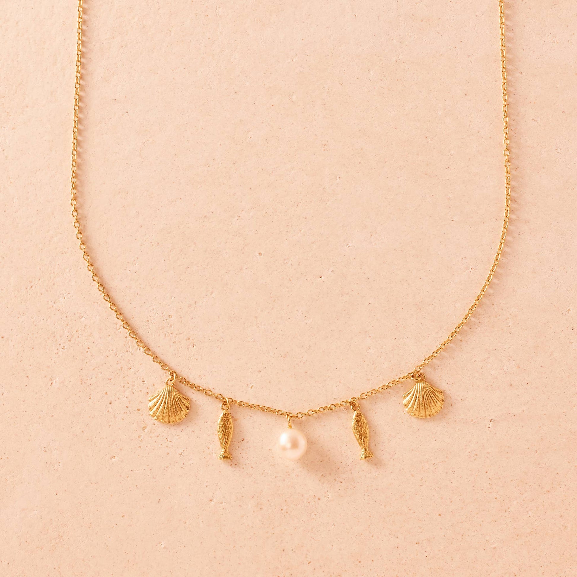 The ultimate summer necklace. Seashells, fishes and a pearly centerpiece harmoniously arranged to capture the spirit of the sea. Wear it to feel the connection to nature and the joy of summertime gatherings.