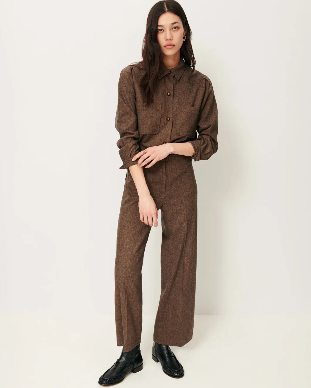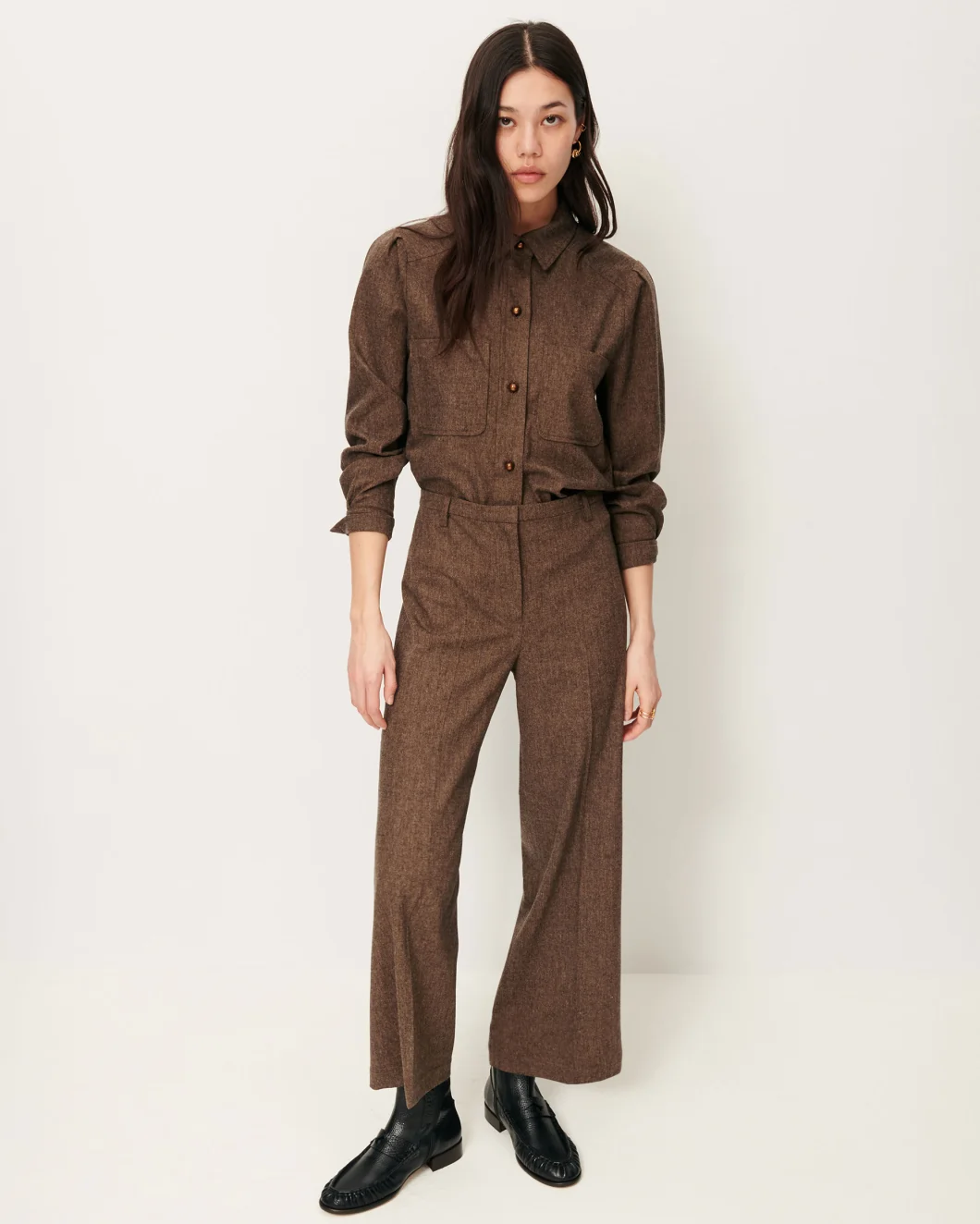 Straight-leg trousers with sharp pleats in soft marengo flannel with a chambray-effect, woven in Italy.