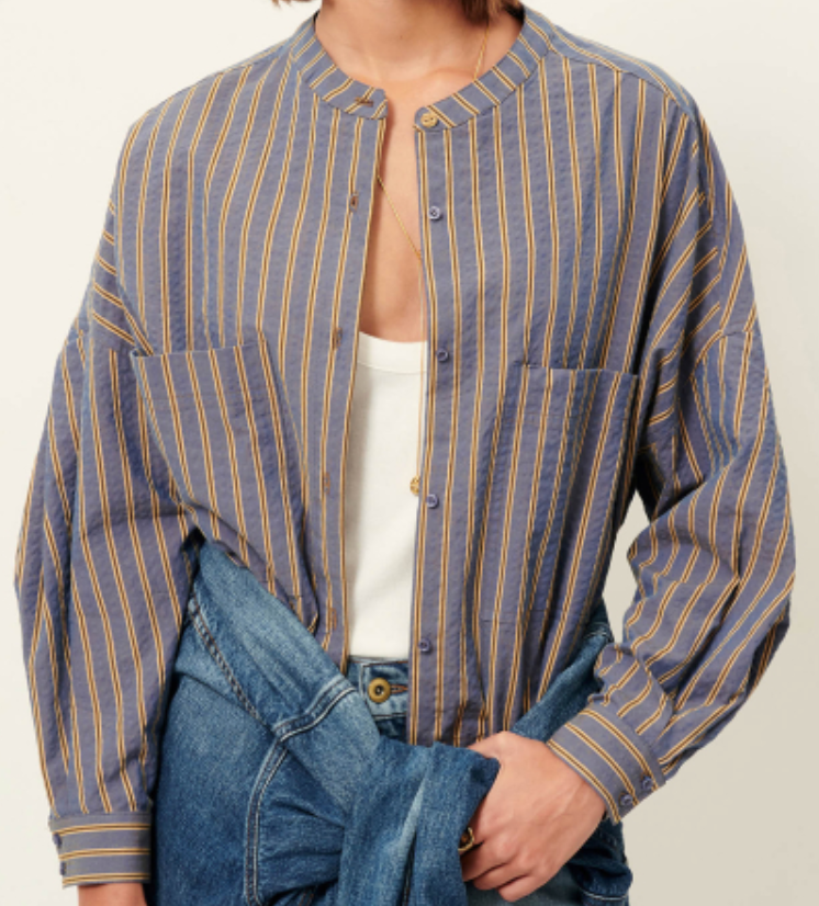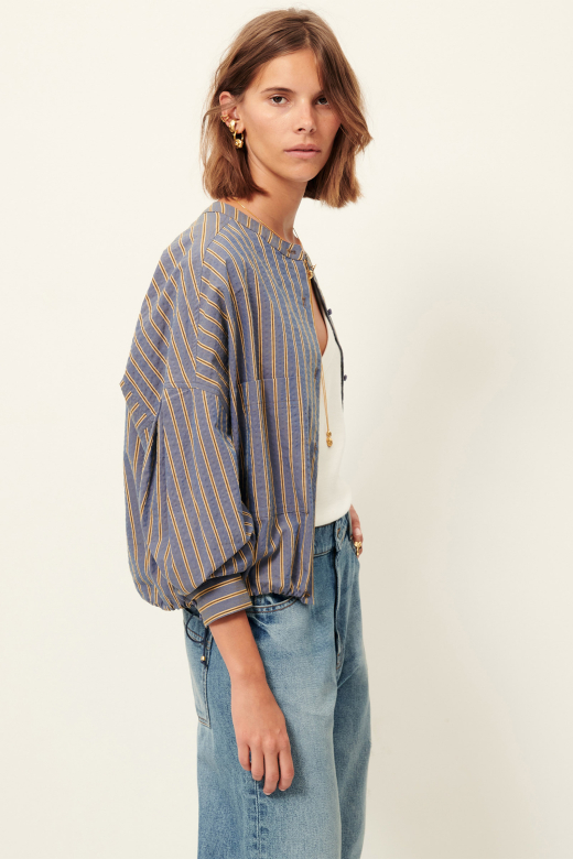 Round-neck blouson-style shirt in Cotton seersucker fabric with a heathered effect and contrasting fancy stripes, woven in Italy. Cinched at the waist with decorative ties to knot at the sides.
