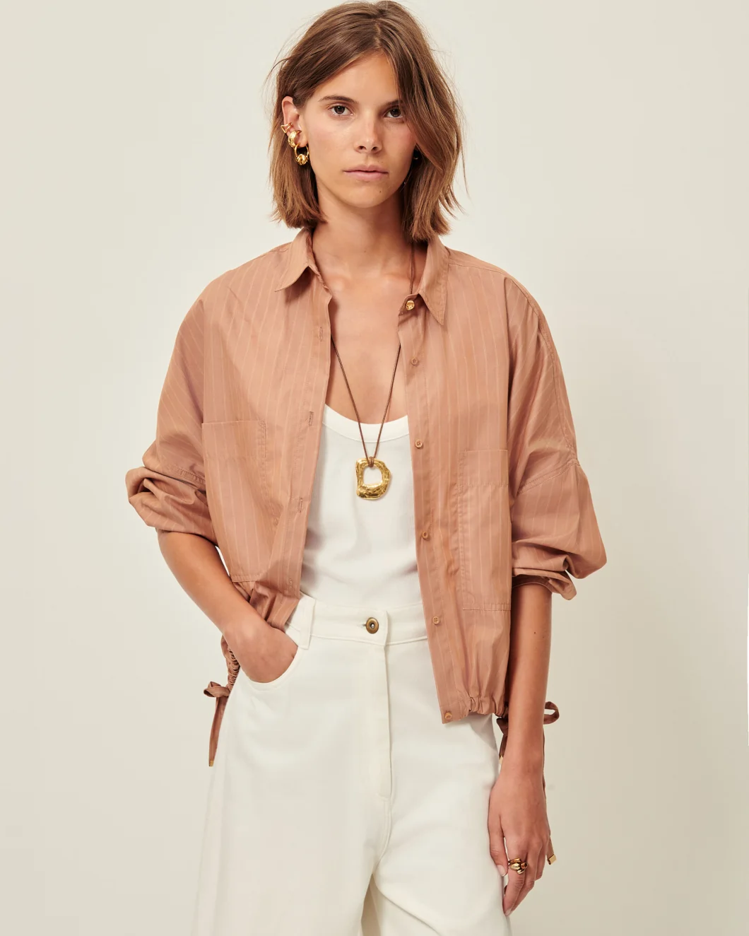 Cinched with ties at the waist.