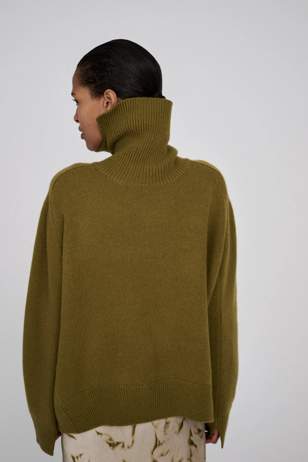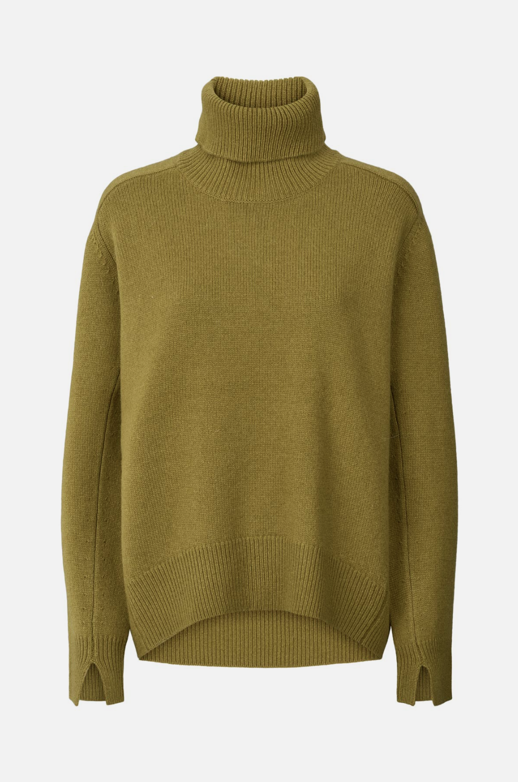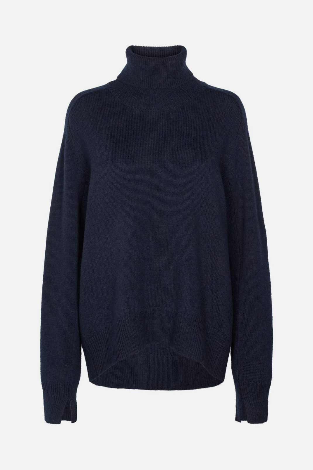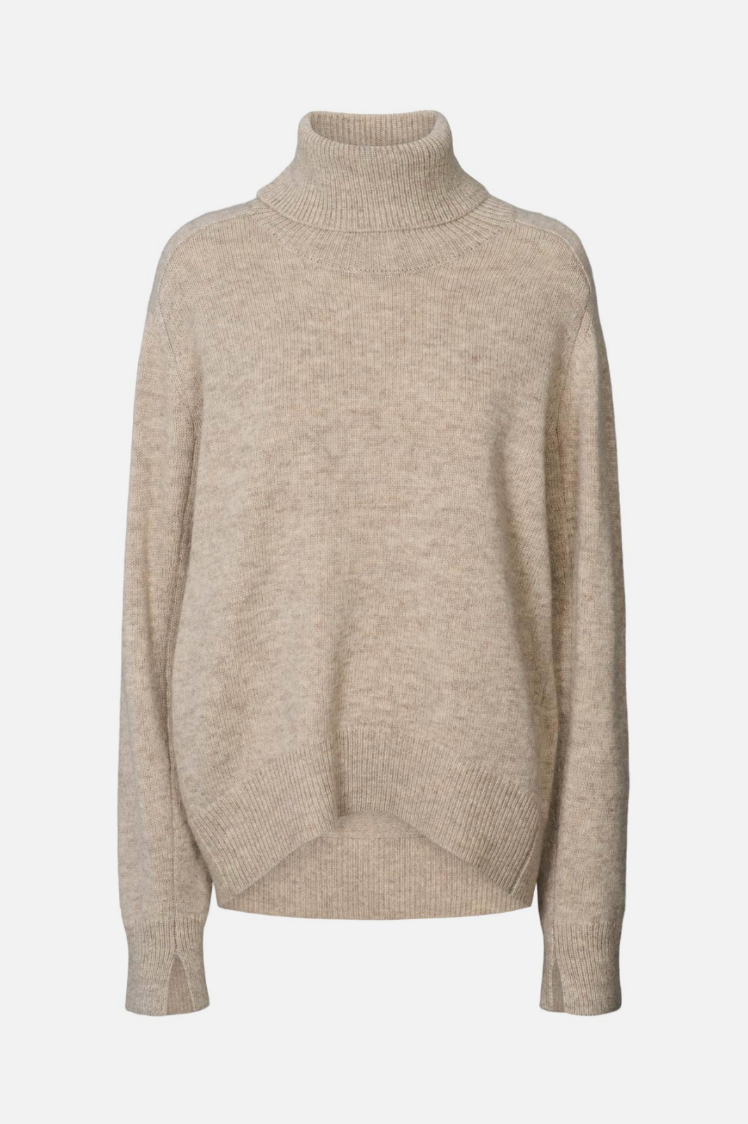Crafted from a soft wool, the knitted roll neck is defined by a relaxed shape with a turtleneck with a slit in the back and long sleeves with ribbed edges and slits.