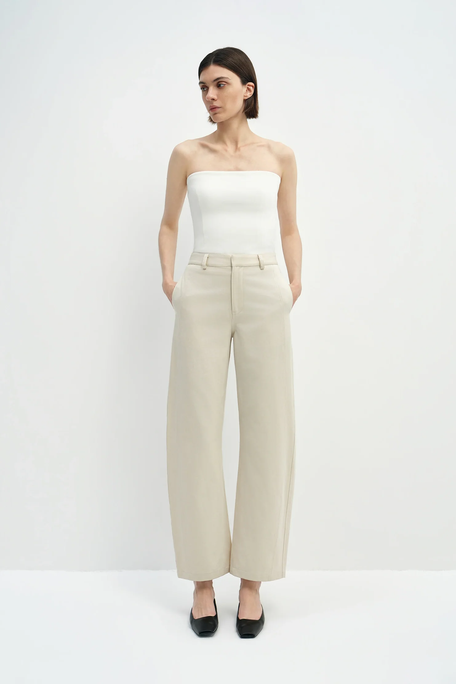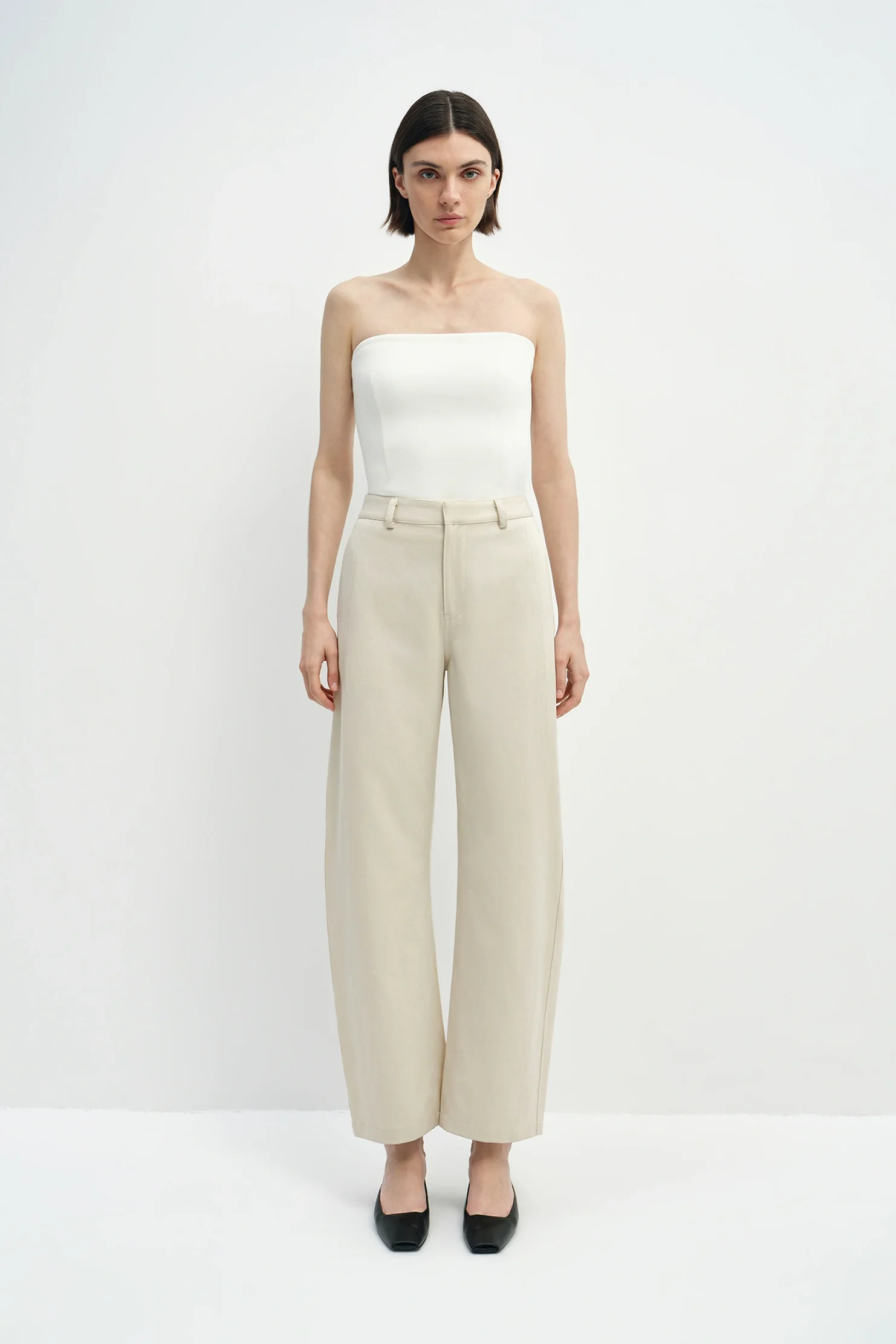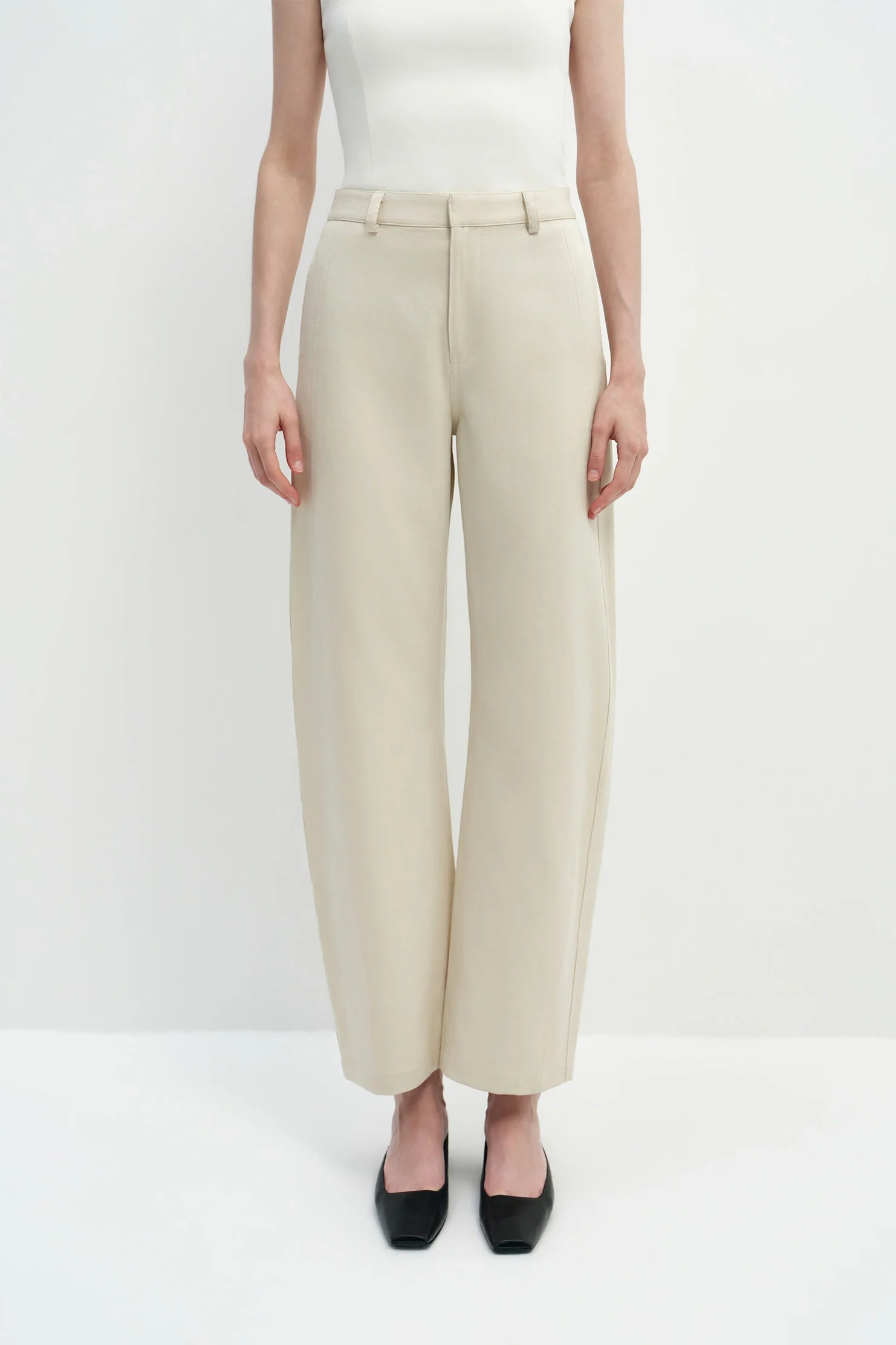 A softly structured barrel-leg pant crafted from a breathable cotton-lyocell blend, offering sculptural volume with relaxed sophistication.