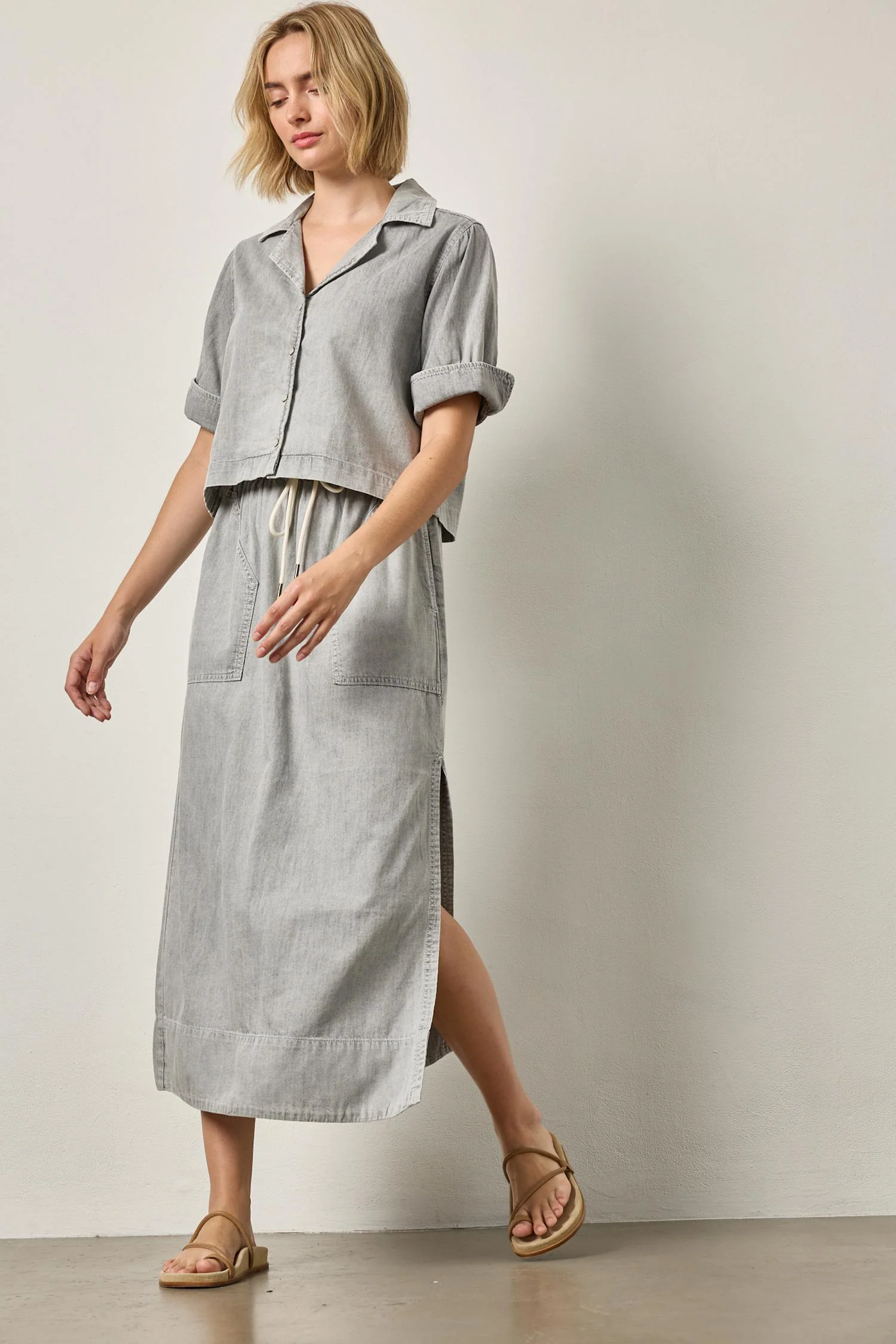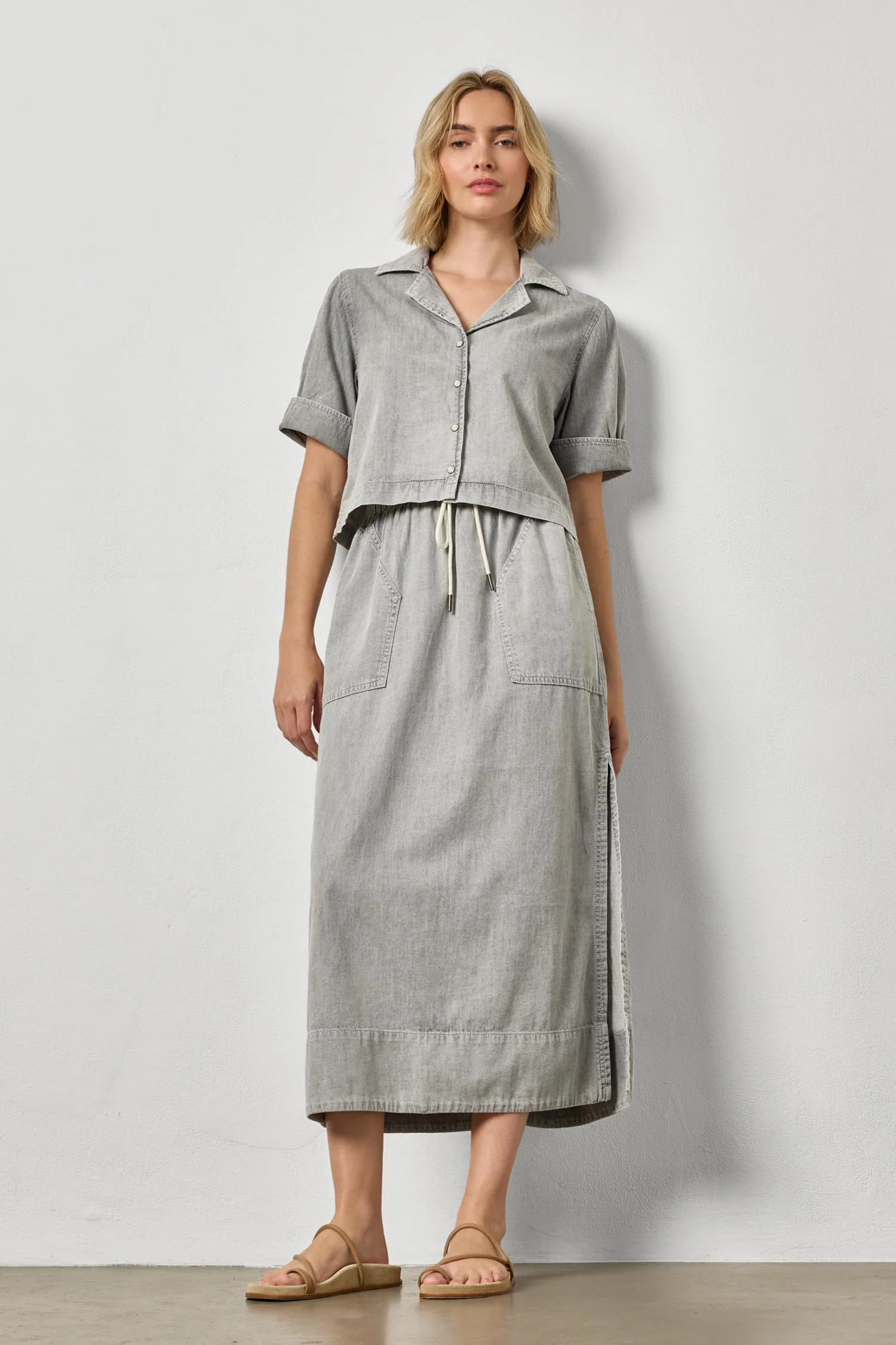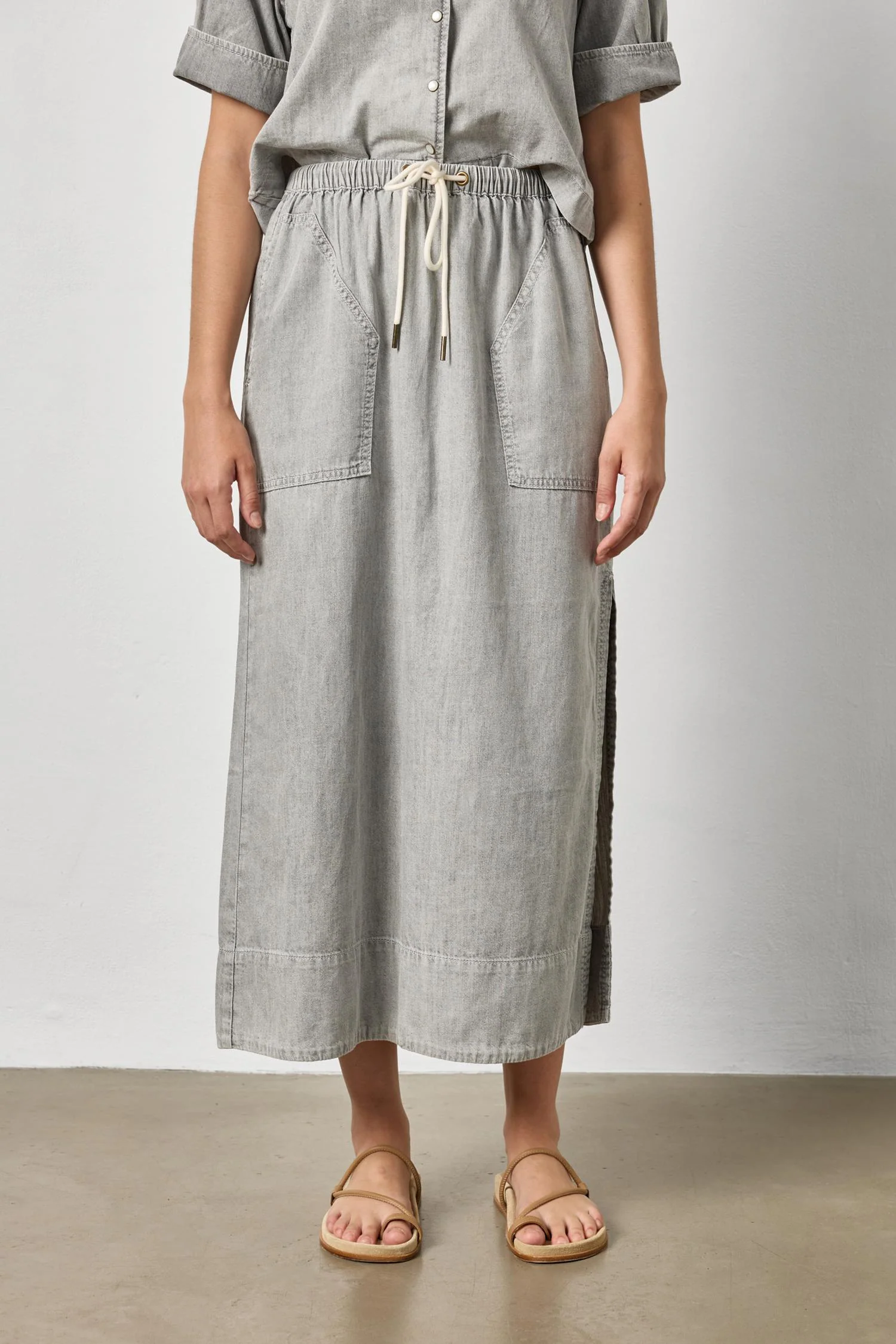 Our Denim Drawcord Skirt brings ease and versatility to your spring wardrobe. Designed in our lightweight 100% cotton denim, this skirt features front top-applied pockets, an elastic waistband, and a functional drawcord for all-day comfort. A side slit adds movement and a flattering touch, making it an effortless option for everyday wear. Pair it with one of the coordinating denim tops for a head-to-toe set, or style it with a spring sweater or classic tee for an easy, relaxed look.