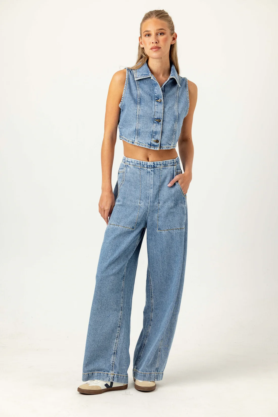 The effortlessly cool, wide-leg fit shown styled with the Josie Shirt