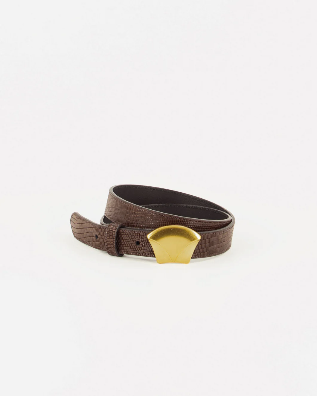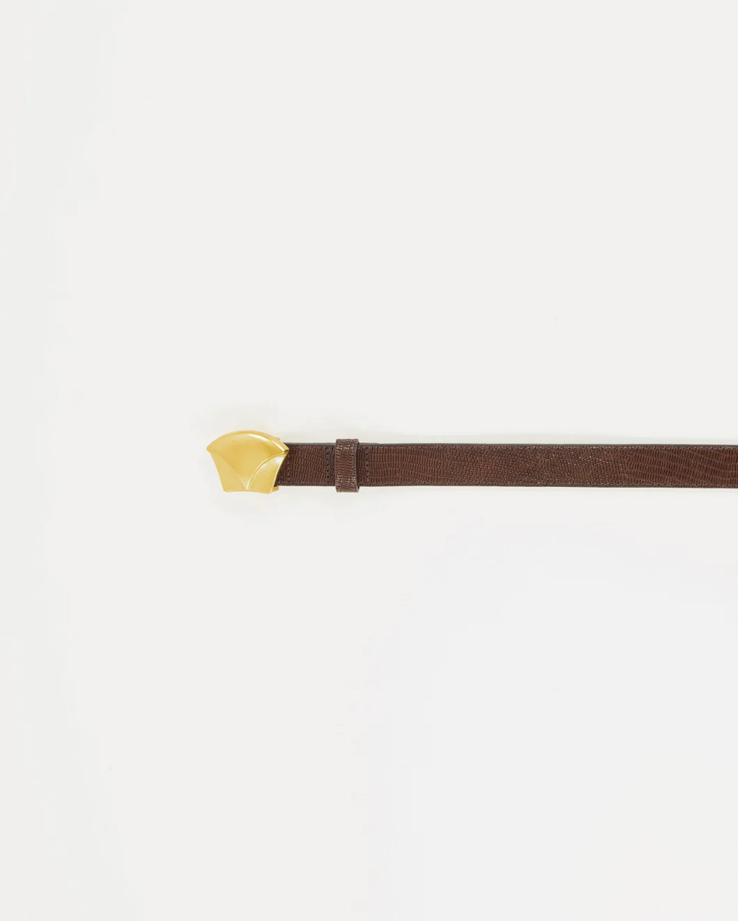 Cowhide lizard-print belt. Collar-stud buckle, developed exclusively by Sessùn.