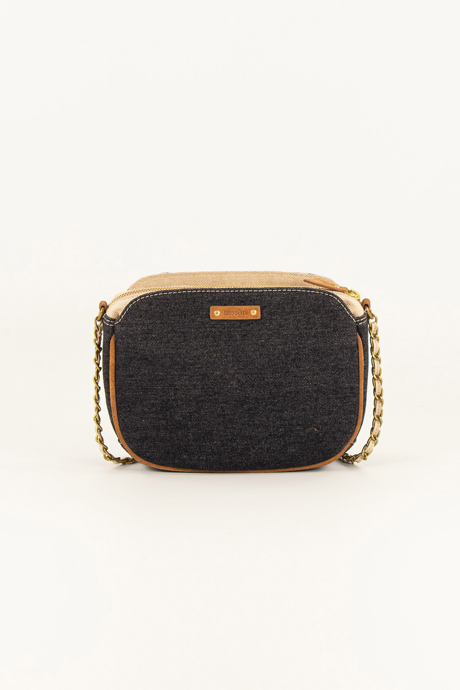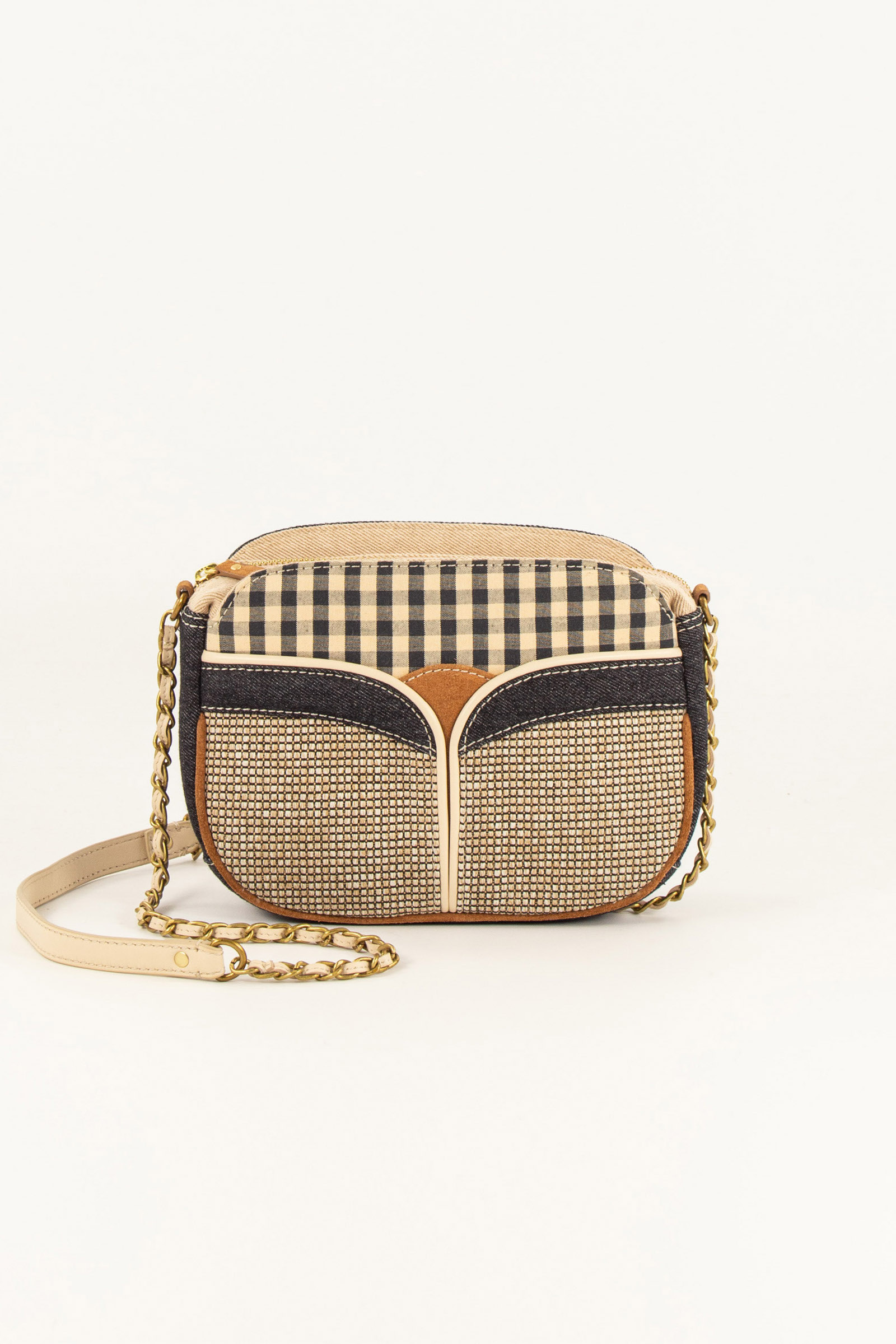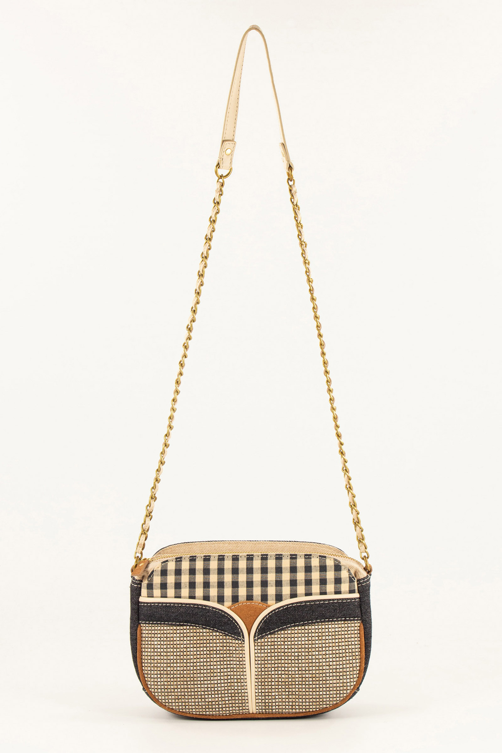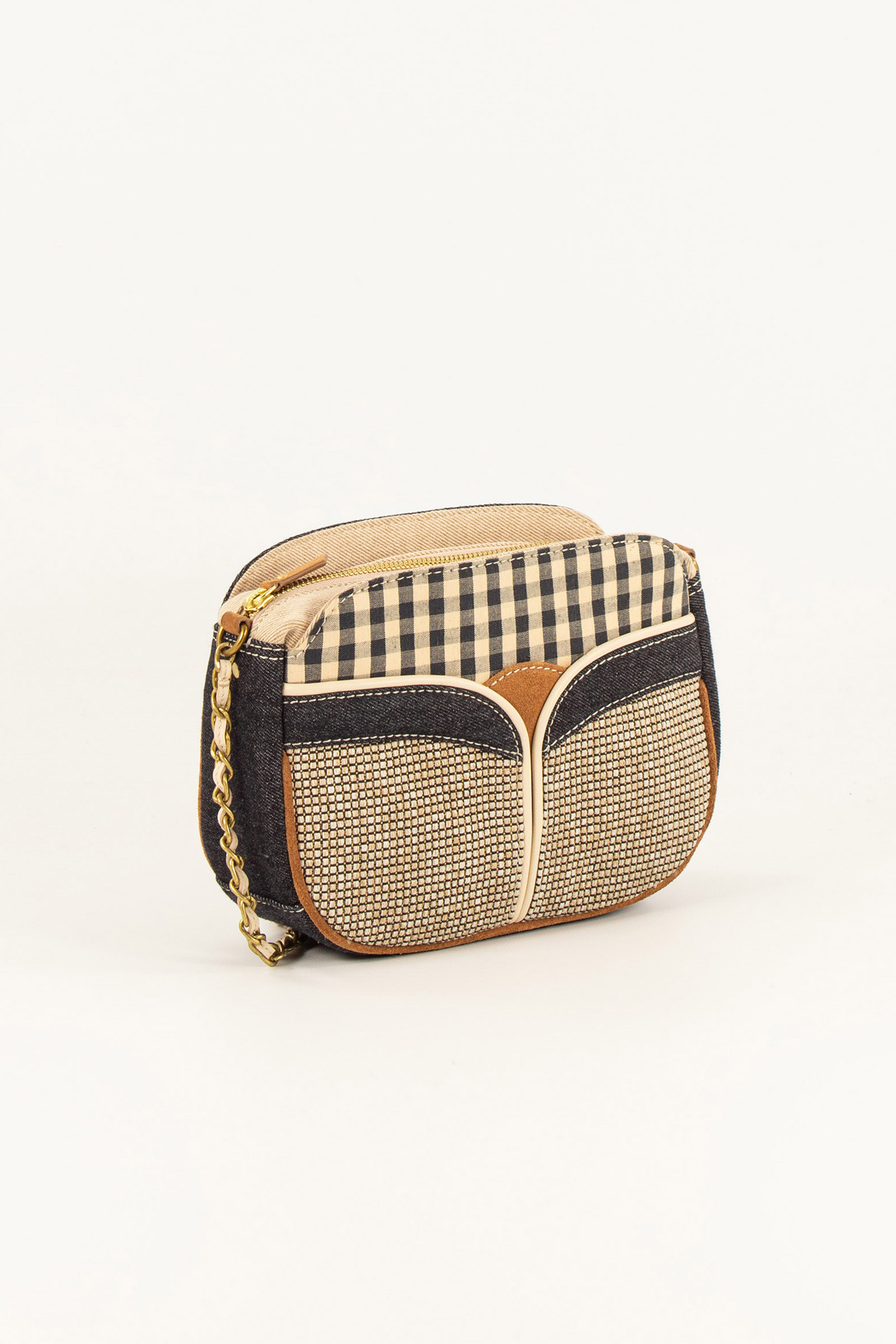 Mixed-material bag in denim and cotton canvas, with decorative fabric inserts. Lambskin leather and cowhide leather details.