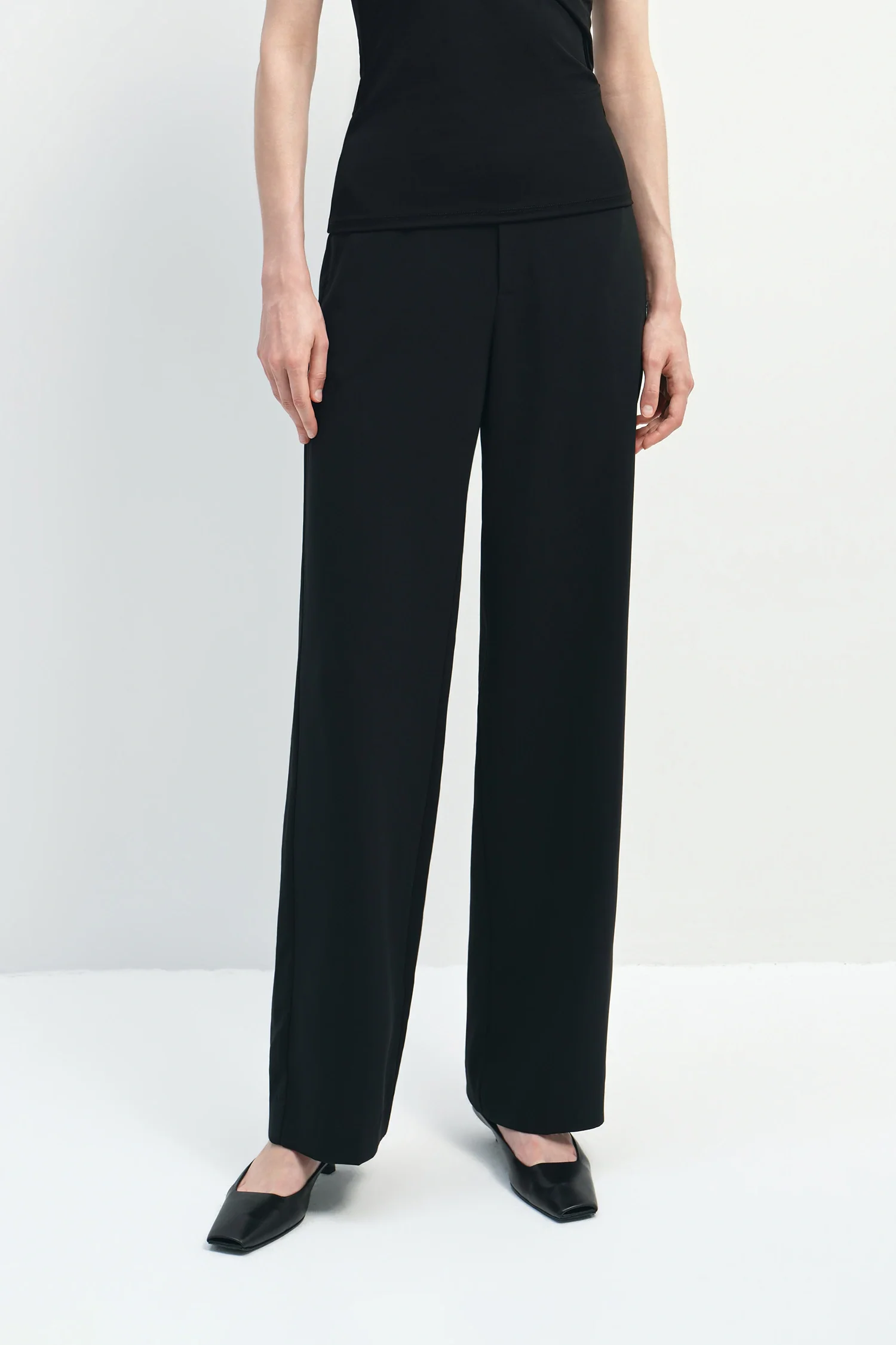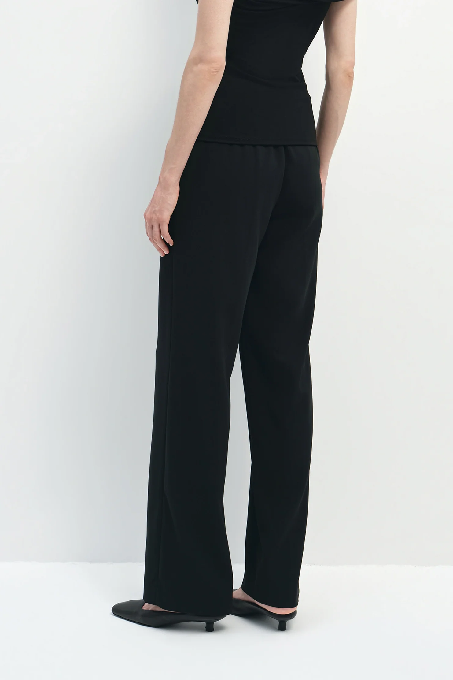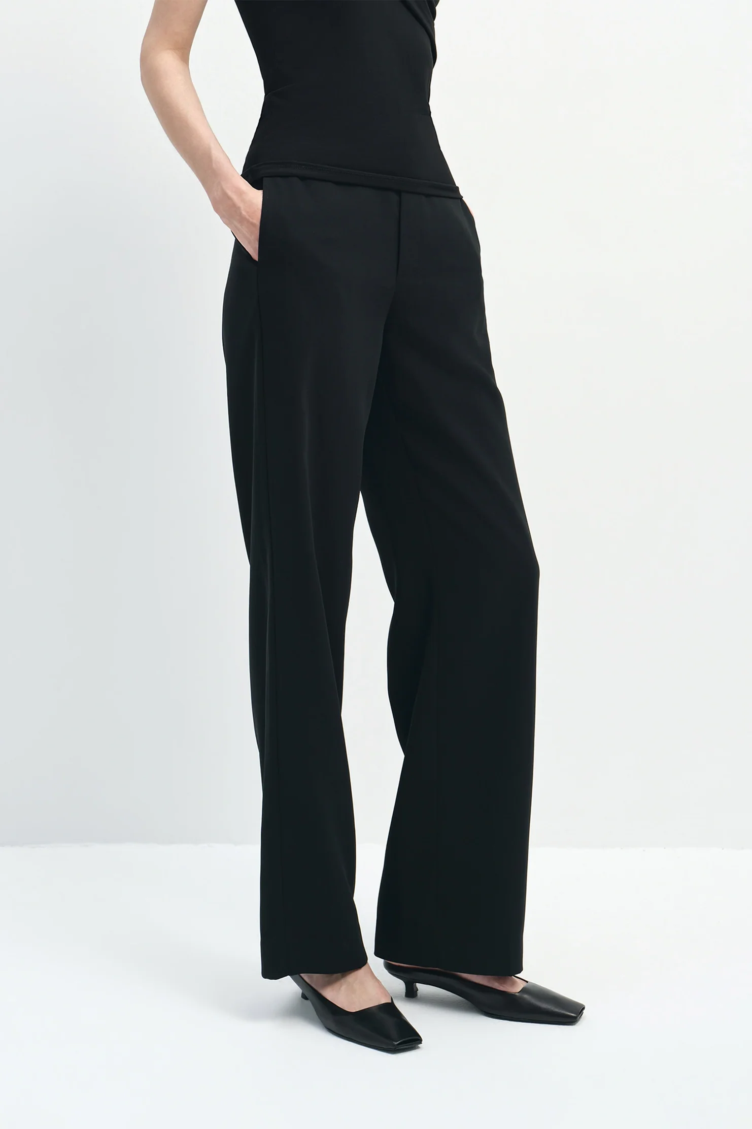 A relaxed tailored pant featuring a cinched back waist, combining polished structure with everyday comfort and ease.