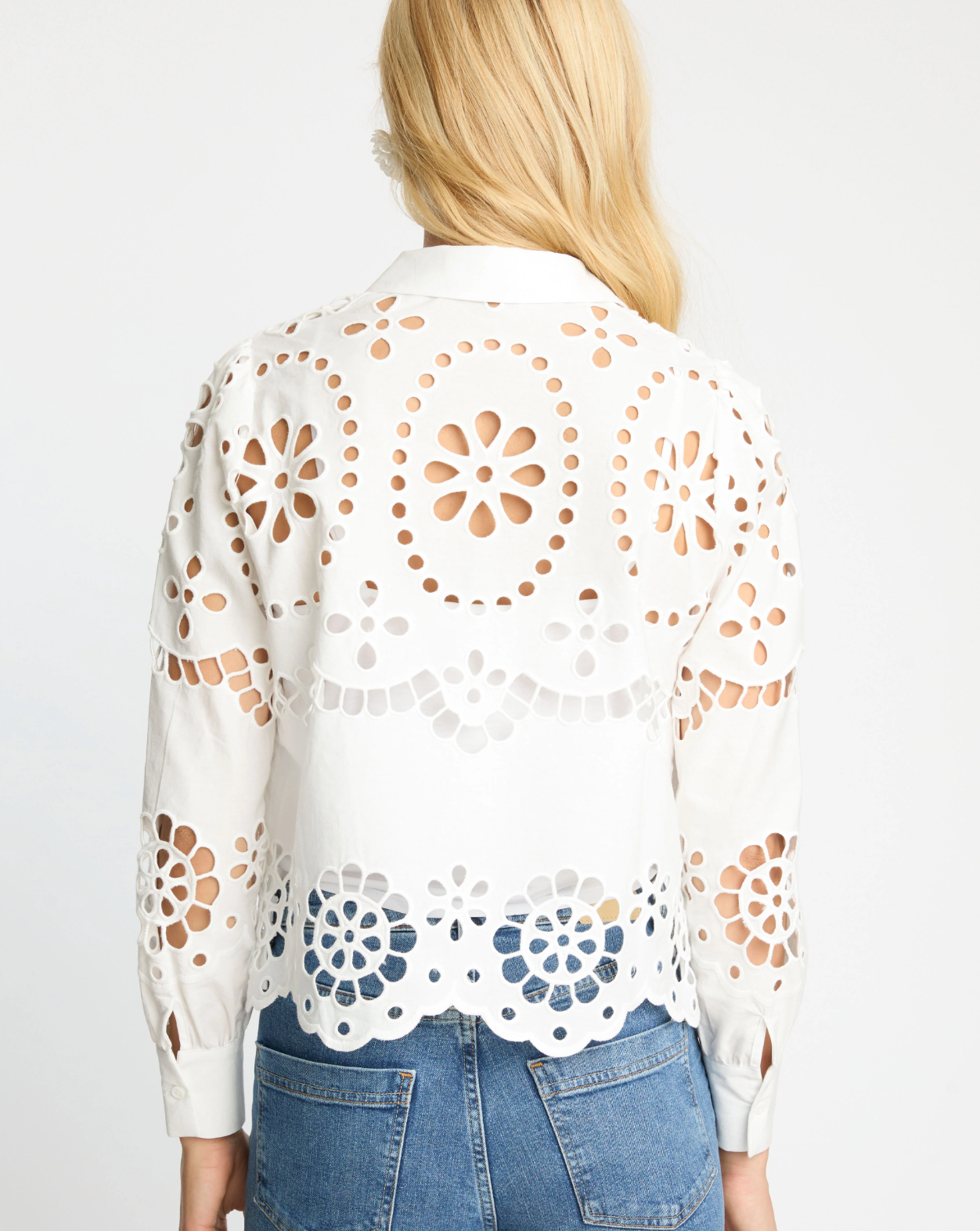 Make a statement in our Emmie Top in White Eyelet Lace. Made from cotton, this top offers a delicate, floral-inspired design with a subtle peek of skin and a touch of bohemian charm. The classic button-down silhouette is updated with long sleeves and a scalloped hem, striking the perfect balance of refined sophistication and playful detail.