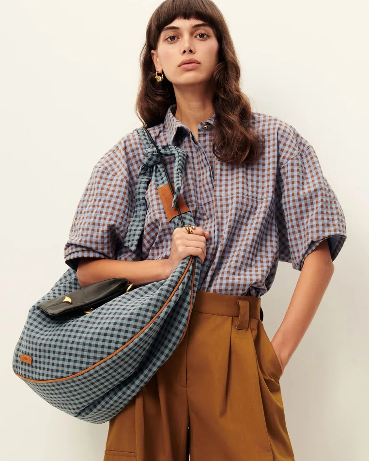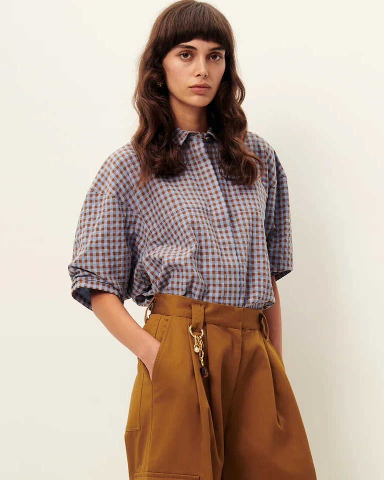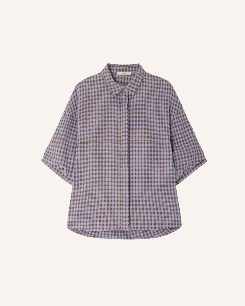 Blouse with short balloon sleeves, made from lightly textured cotton fabric with a two-toned gingham pattern, woven in Spain.