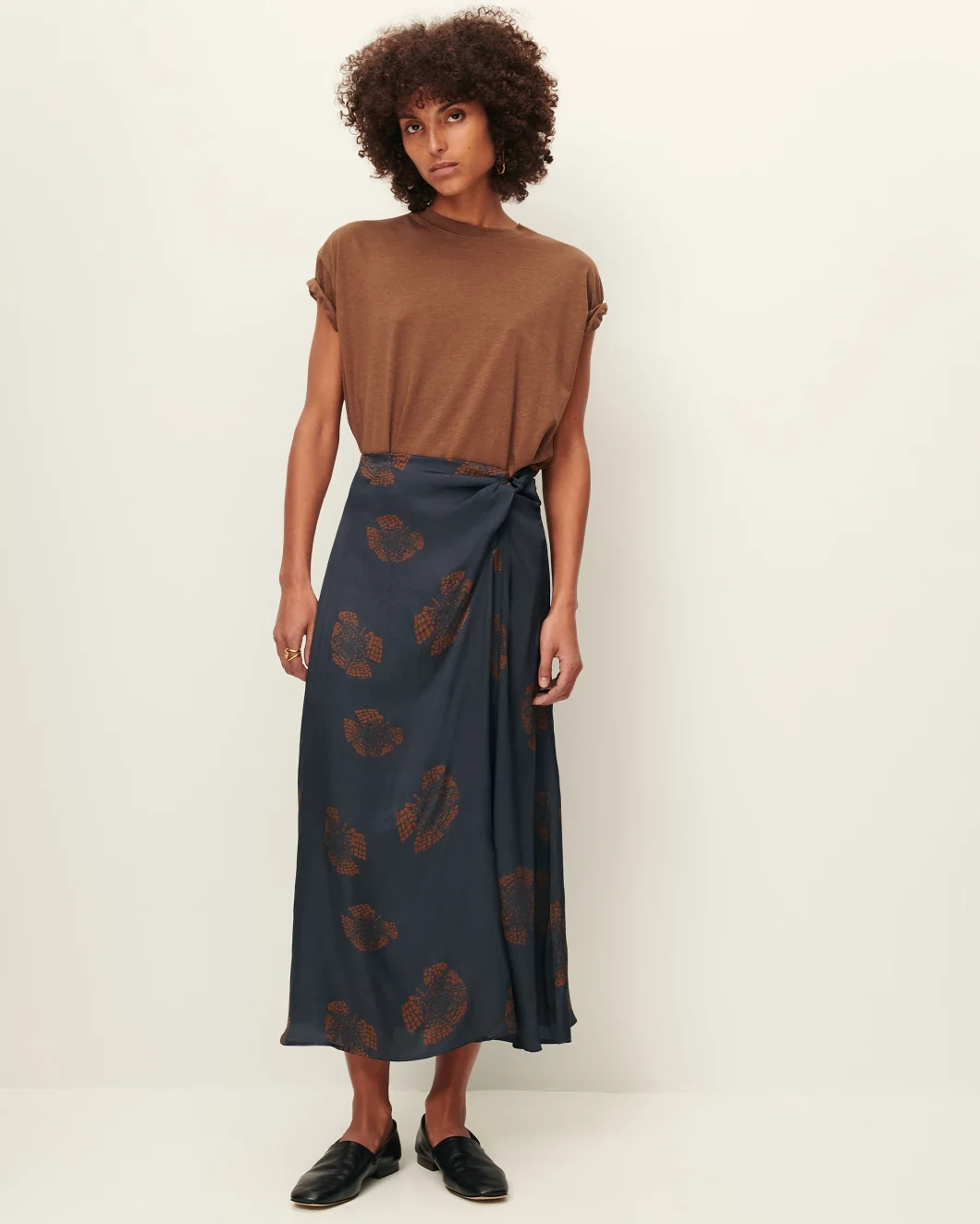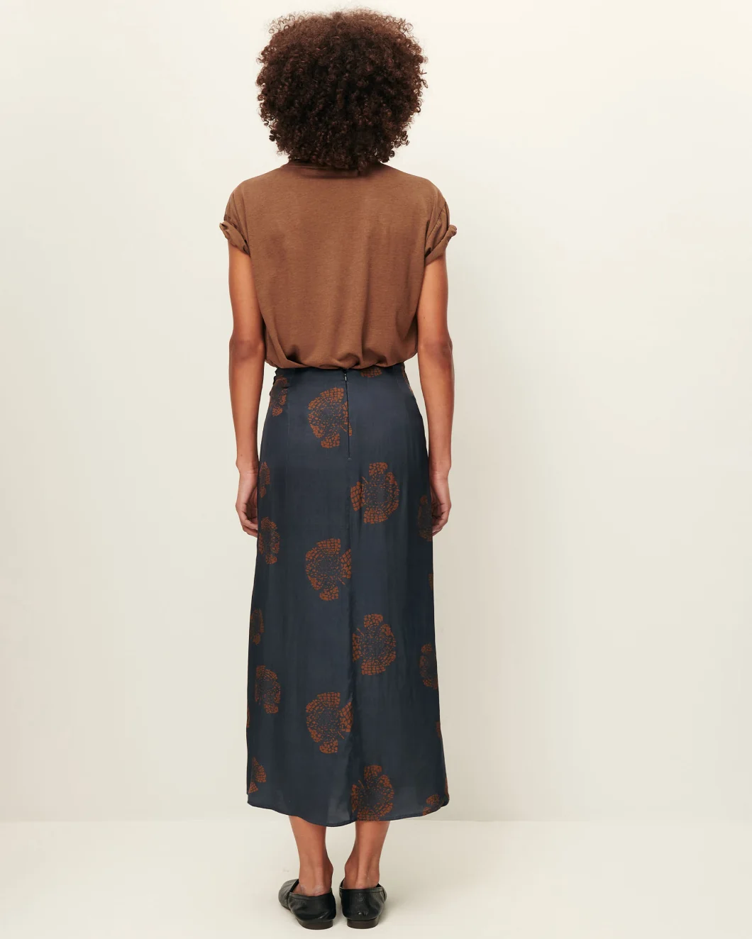 Mid-length straight skirt with a slit in a fluid satin print fabric, printed and finished in Italy, exclusive to Sessùn.