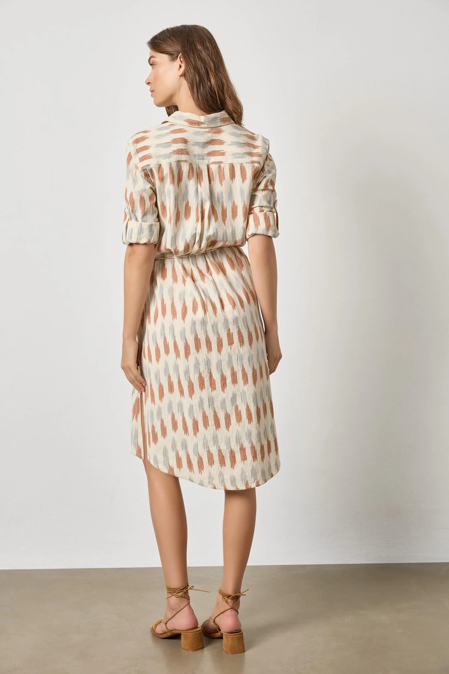 Our Ikat Shirt Dress is a modern update to a timeless silhouette woven in a classic Ikat technique. Our classic pocket-front shirt dress has rolled tab sleeves, a rounded hemline, and an optional self-belt. The versatile design allows it to be worn open as a lightweight duster over a tee paired with denim. Effortless, flattering, and endlessly wearable, this midi dress transitions with ease through the season.