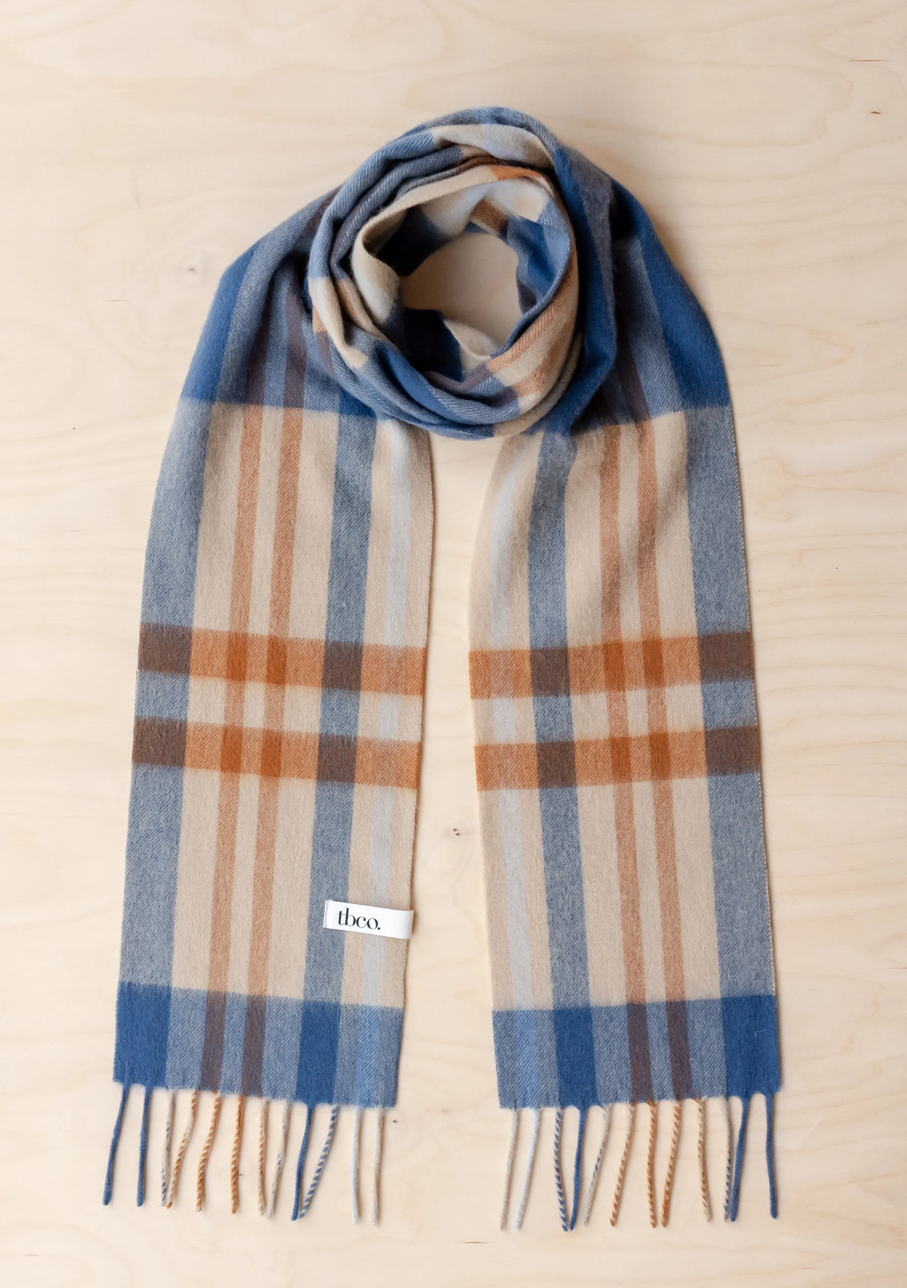 Merging timeless patterns with modern colours is what we do best. Elevate your outfit with this extra long TBCo skinny scarf in a modern camel and blue tartan check. It's woven from soft and thermo-regulating lambswool for optimised comfort and warmth. The perfect finishing touch.