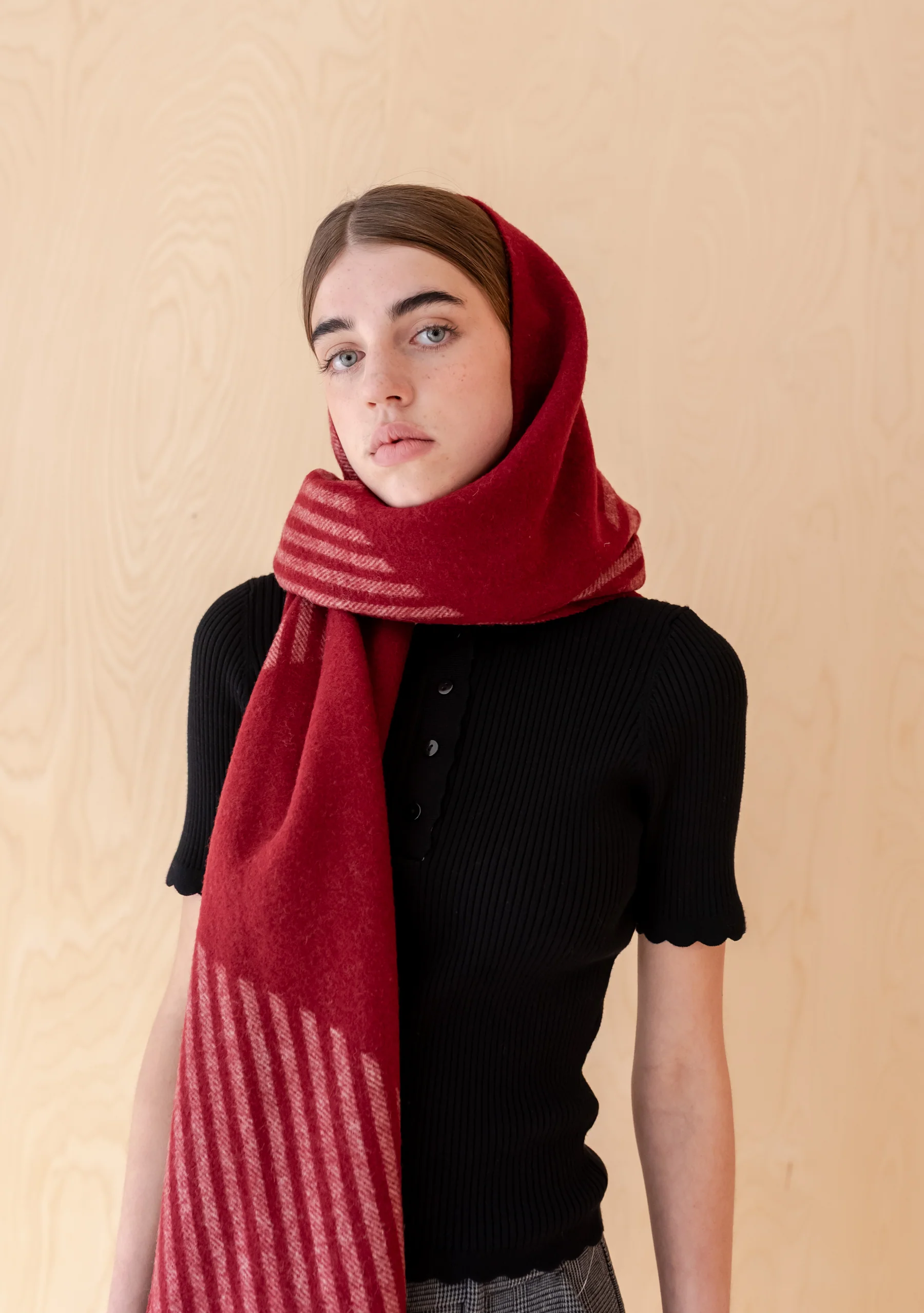 Merging timeless patterns with modern colours is what we do best. Elevate your outfit with this oversized fringed TBCo scarf, featuring a burgundy red stripe wave pattern. It's woven from super soft 100% lambswool for optimised comfort and warmth. This natural fibre is renewable, biodegradable, thermo-regulating and breathable — better for you and for the planet.