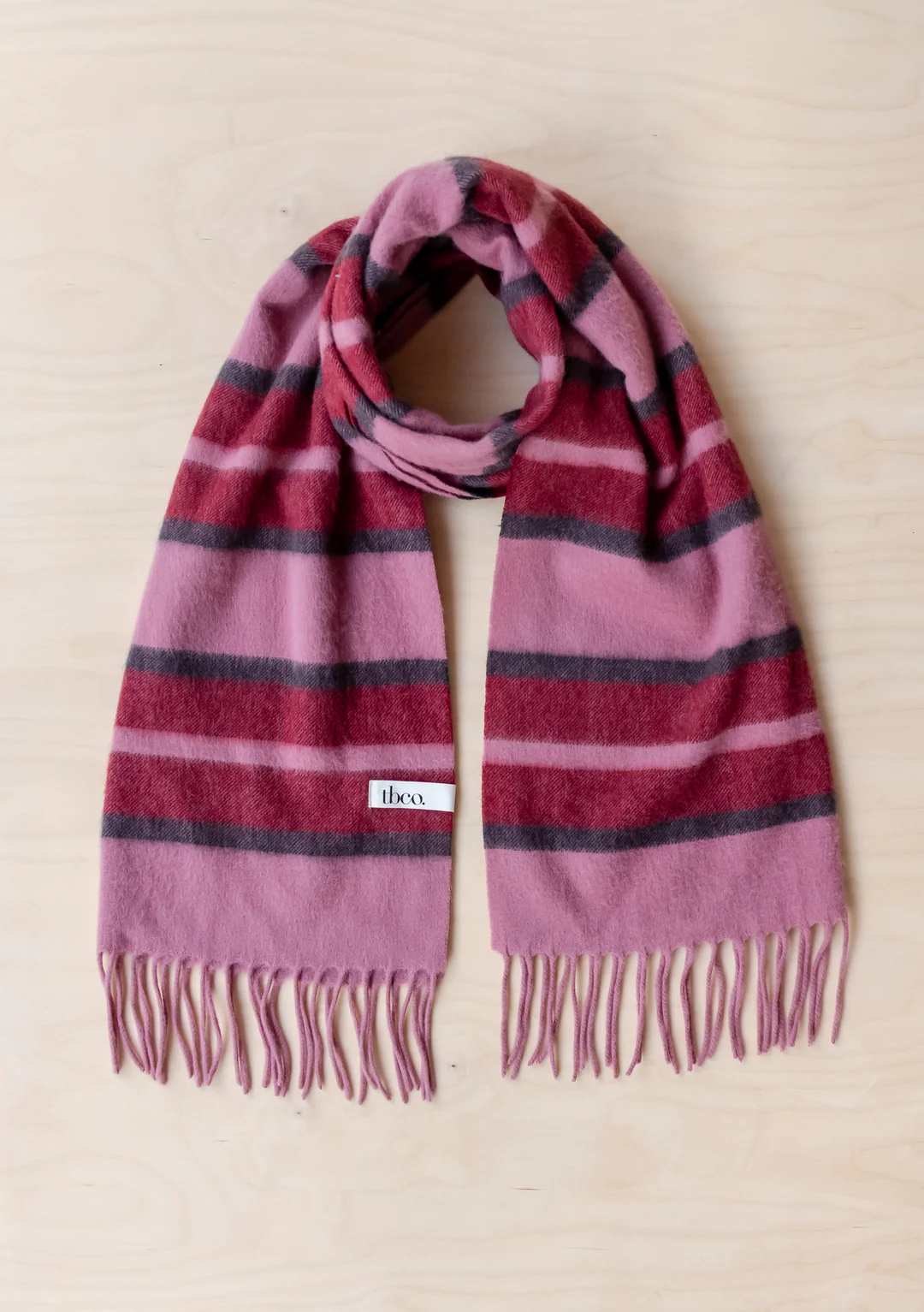 Merging timeless patterns with modern colours is what we do best. Elevate your outfit with this oversized fringed TBCo scarf, featuring a pink and burgundy stripe pattern. It's woven from super soft 100% lambswool for optimised comfort and warmth. This natural fibre is renewable, biodegradable, thermo-regulating and breathable — better for you and for the planet.