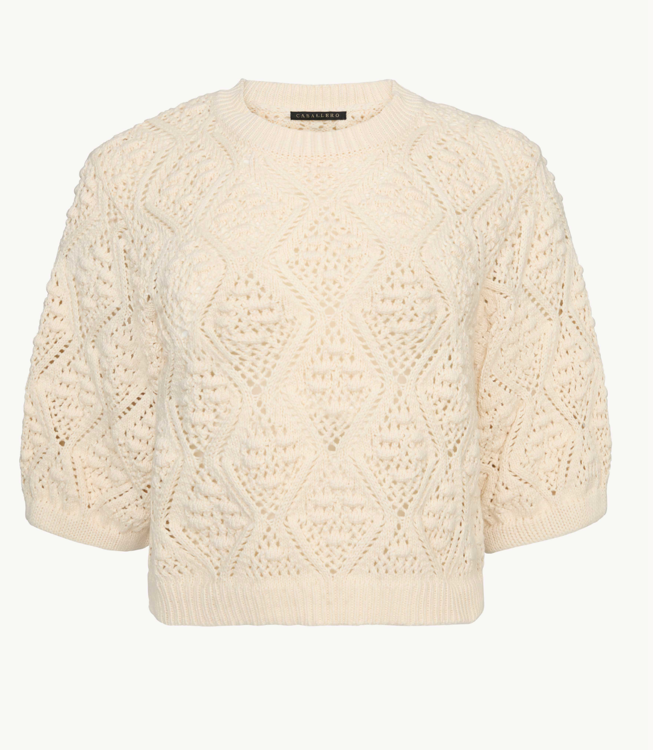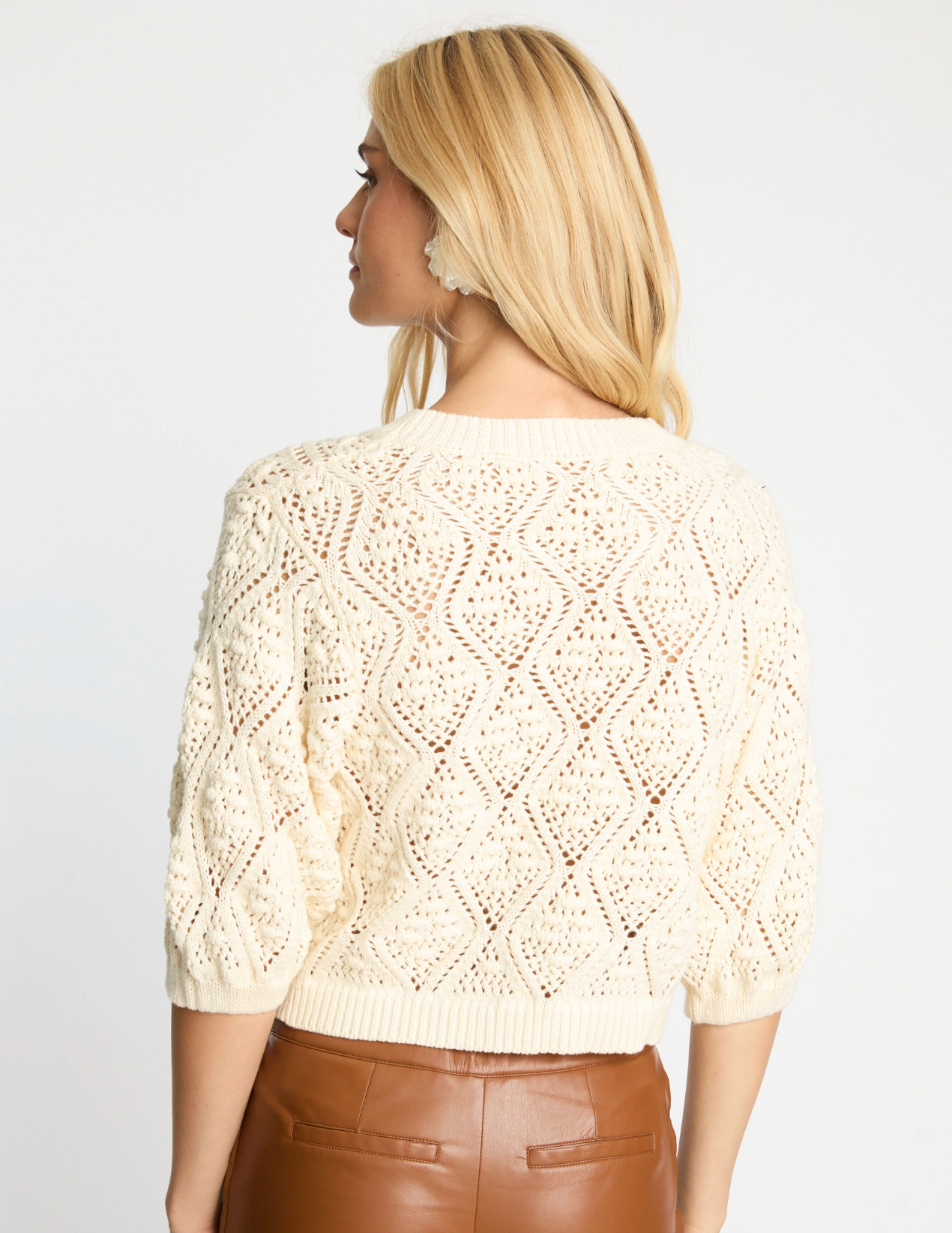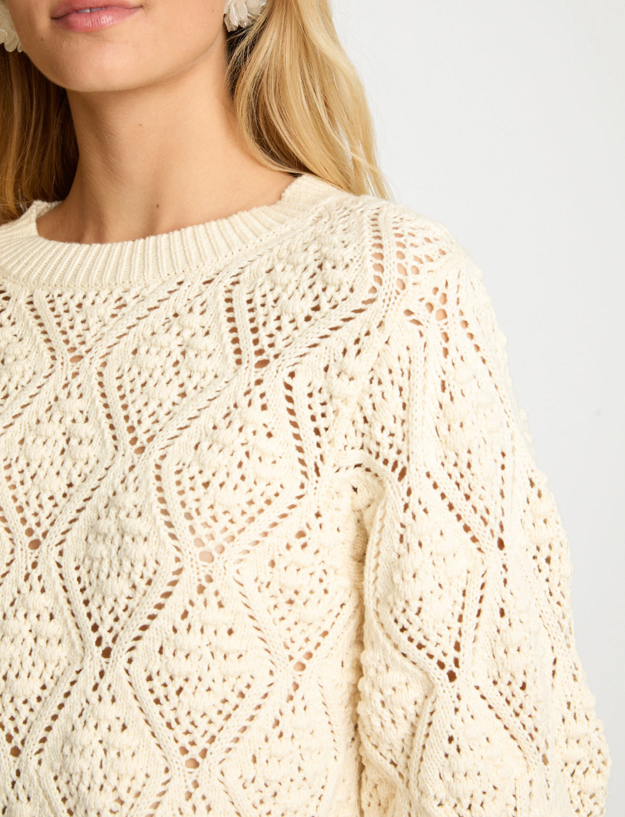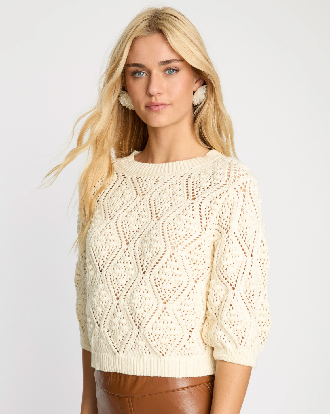 The Layla Sweater in cream is a beautifully textured knit designed to elevate everyday layering. Crafted with an intricate openwork pattern, it features diamond-shaped details interwoven with raised stitches that create depth and visual interest throughout. A classic crew neckline and three-quarter sleeves give the silhouette a timeless, effortless feel.