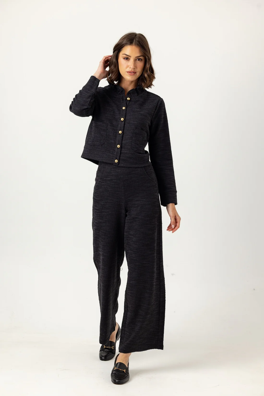 Classic cardigan with patch pockets, a ruffle collar, and elevated gold buttons