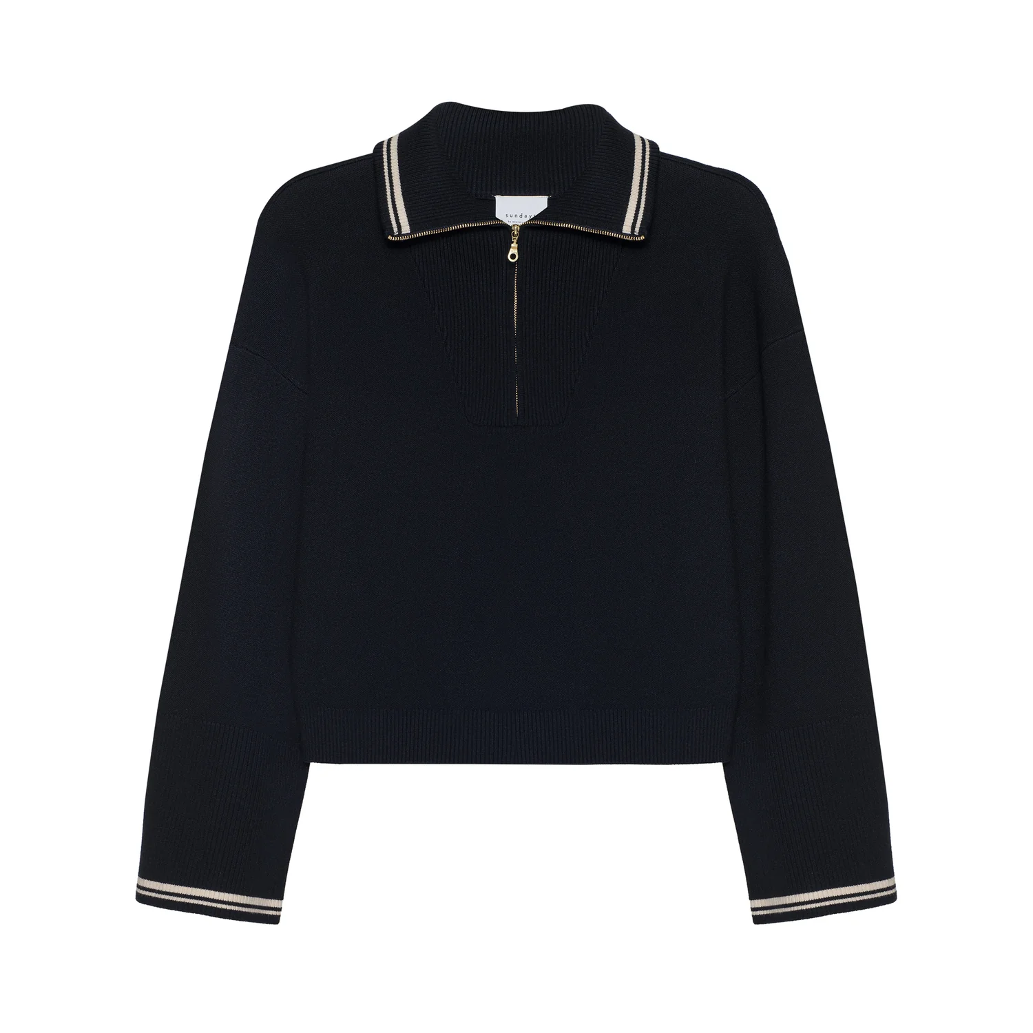 Relaxed by design, Maren is a 1/4 zip with an oversized fold over collar. It features cream accent striping on the sleeve cuffs and collar. Maren is finished with ribbed detailing at the zipper placket, cuffs, and waistline.