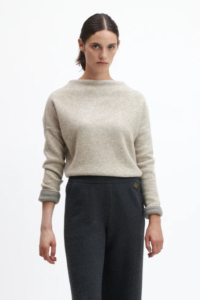 The boxy cut sweater NICOLETTA made of temperature-regulating double-face wool (double knitted from lamb's wool and cotton) is not only cuddly soft to wear, but also looks great! The cotton is GOTS certified (Global Organic Textile Standard). The sweater is knitted and milled in Tyrol! Goes perfectly with jeans!