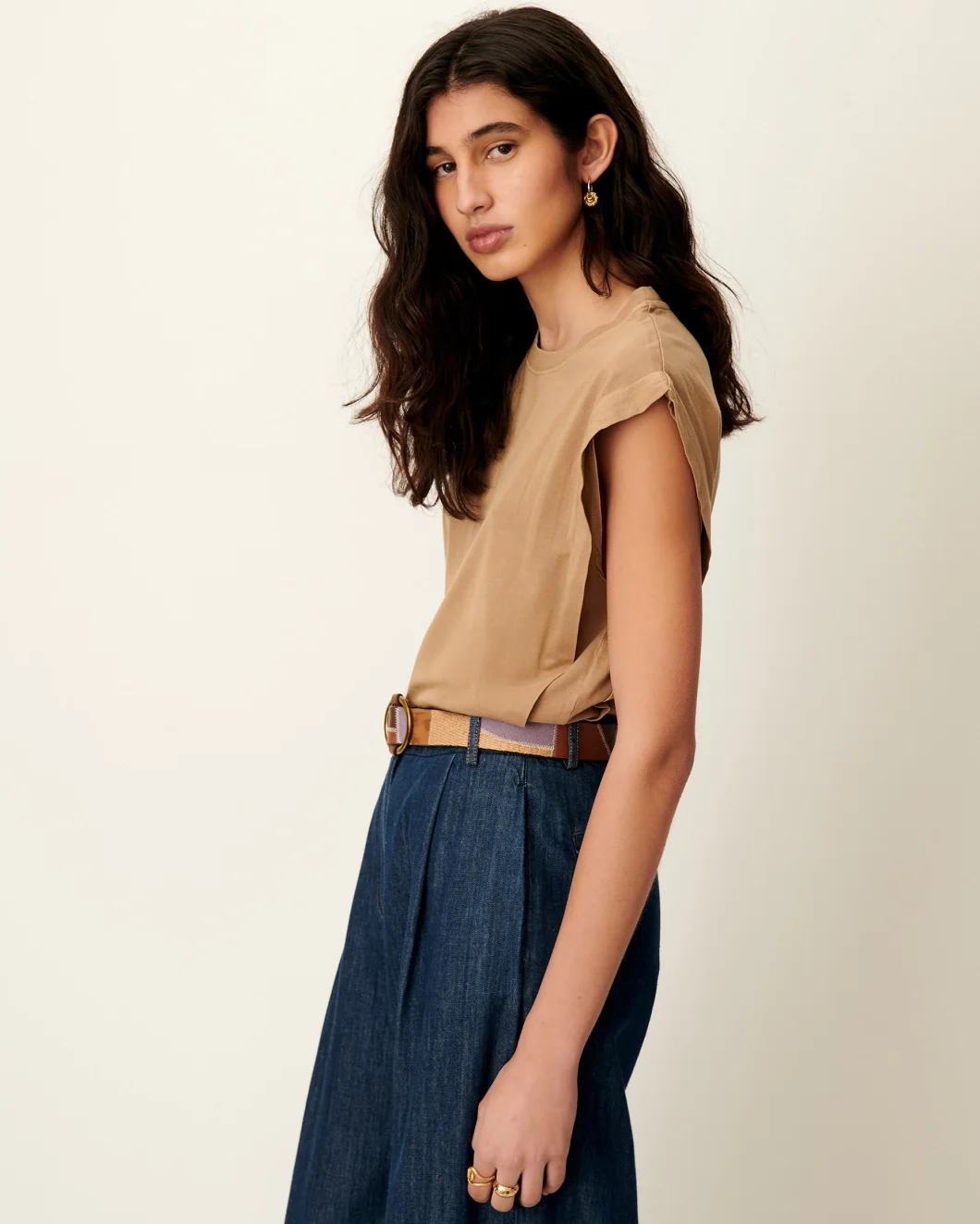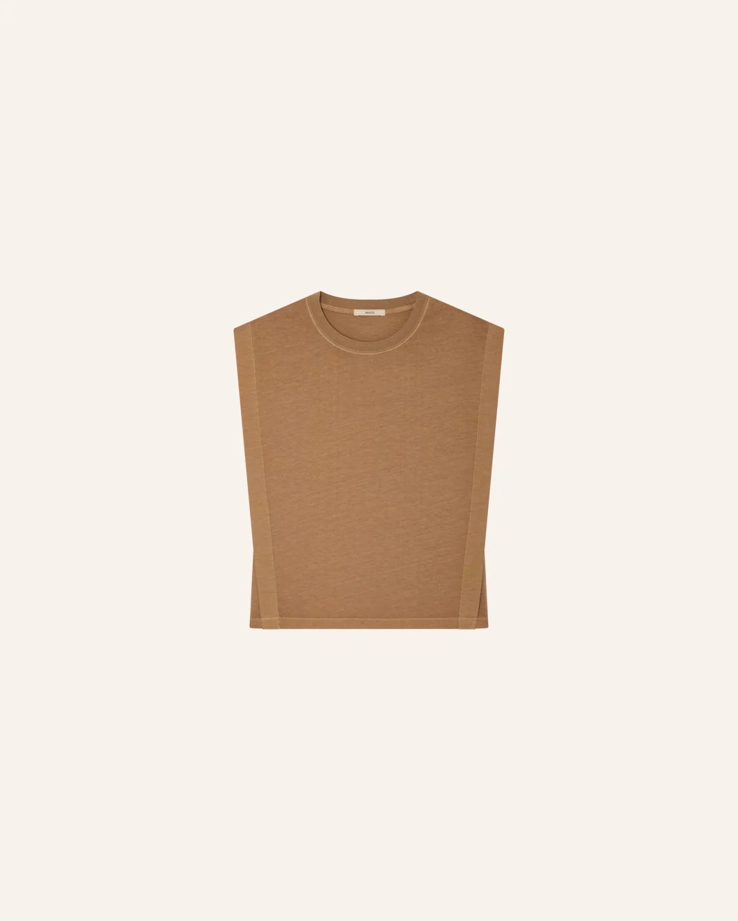 Sleeveless pleated T-shirt in pigment-dyed jersey, hand-crafted and dyed in Portugal.