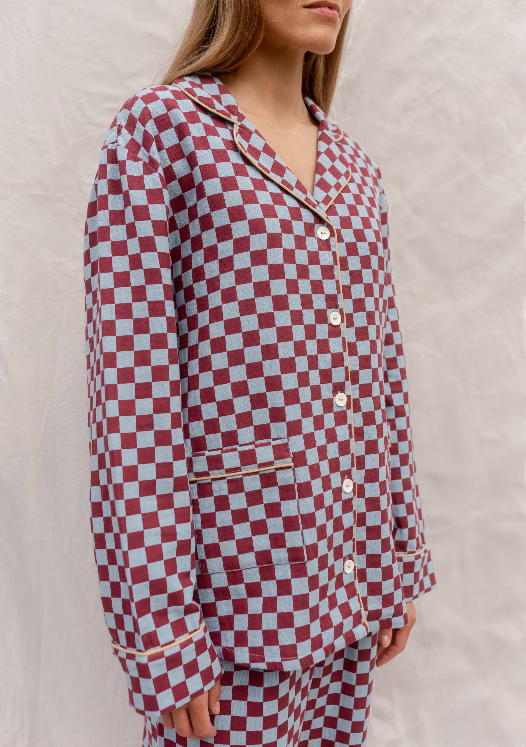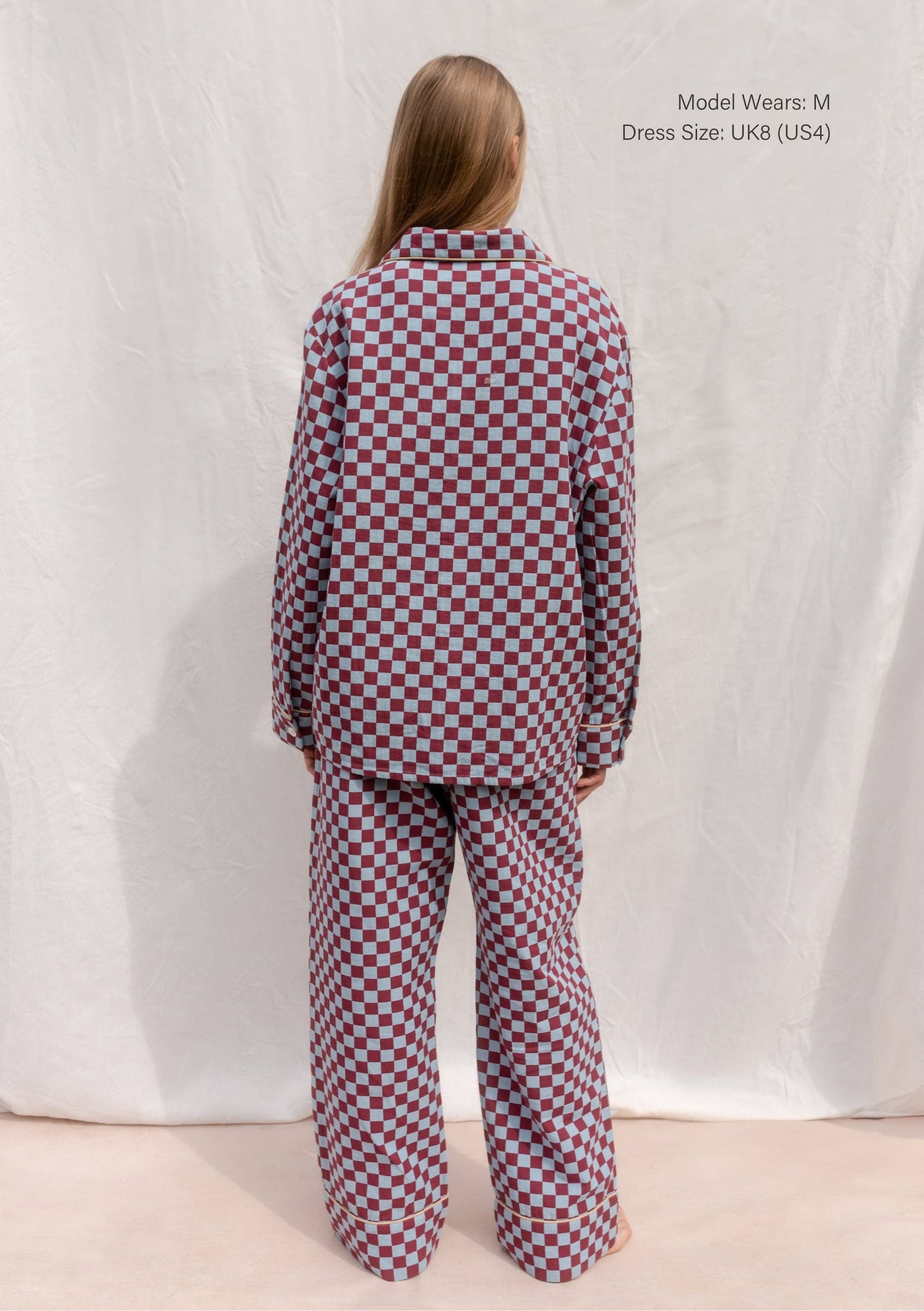 Designed to blur the lines between sleep, lounge and leisure, these pyjamas feel as good at breakfast as they do in bed. Crafted from 100% breathable cotton poplin, this comfortable trouser set features a classic blue and burgundy checkerboard pattern. Finished with contrasting piping, plus handy pockets and an elastic waistband for everyday ease. Includes a matching scrunchie and cotton drawstring bag, perfect for storage when you travel.