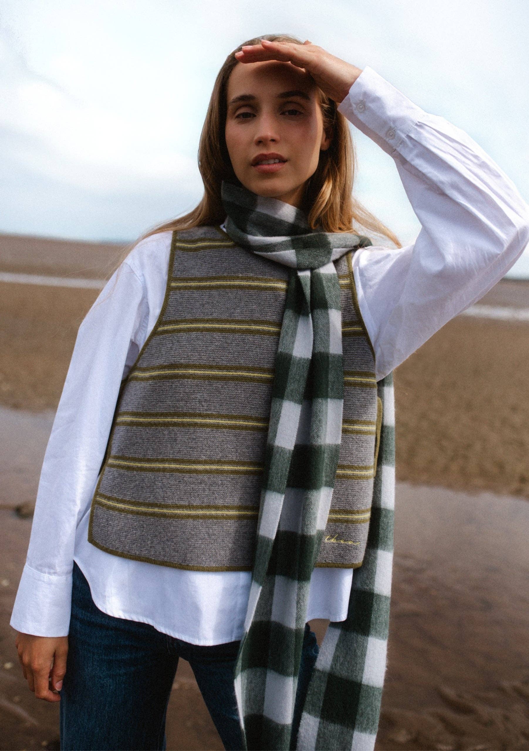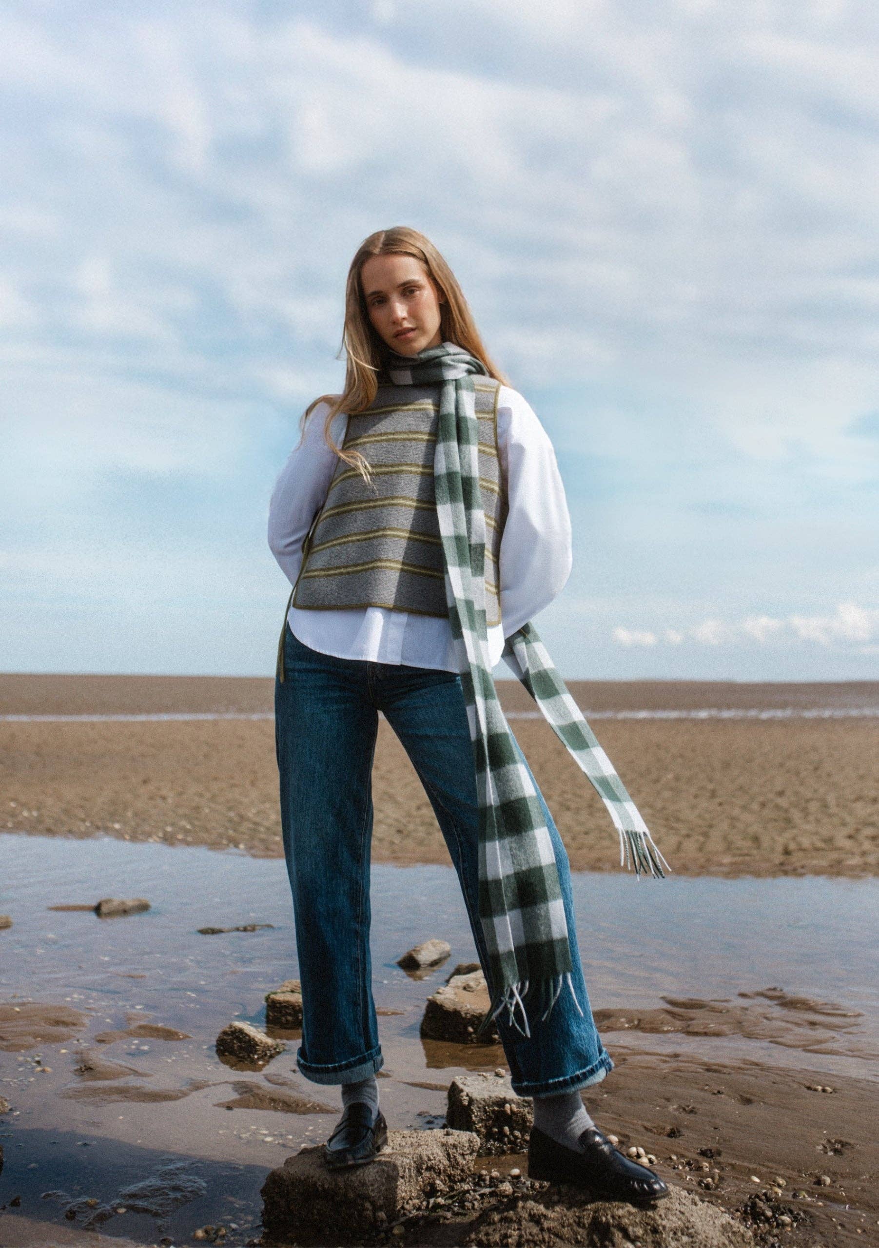 Merging timeless patterns with modern colours is what we do best. Elevate your outfit with this extra long TBCo skinny scarf in a classic forest green and pale blue gingham check. It's woven from soft and thermo-regulating lambswool for optimised comfort and warmth. The perfect finishing touch.