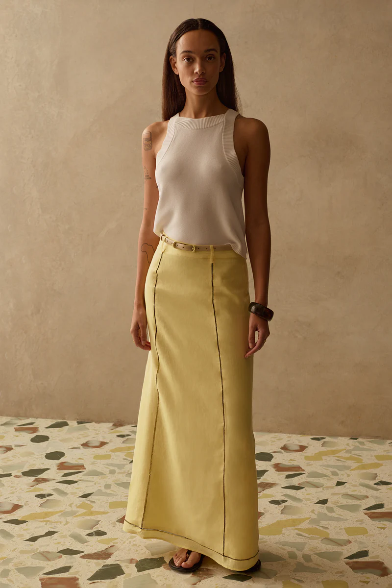 The Indy Skirt is where minimal meets sophistication. With a tailored fit around the waist and A-line silhouette, this skirt also features a contrast stitch detail and a back slit of ease of movement. Pair with the matching Nancy Top for warmer weather or a knit sweater tucked in for the cooler months.