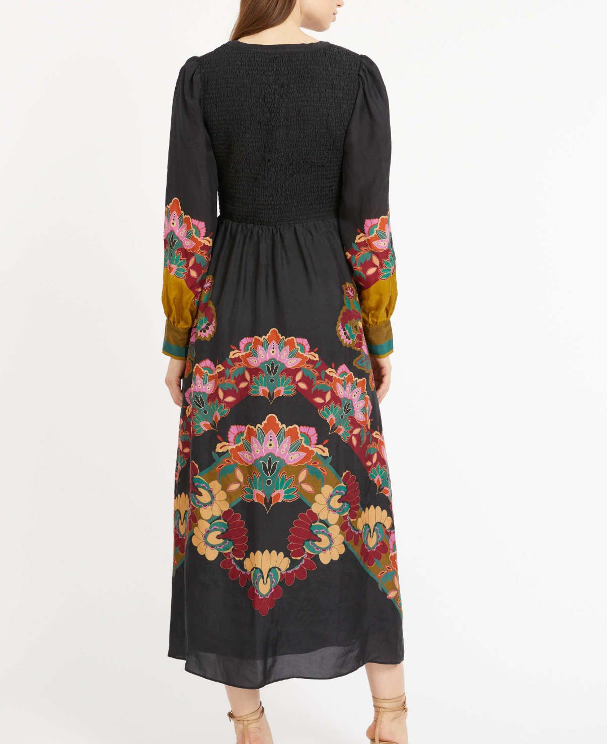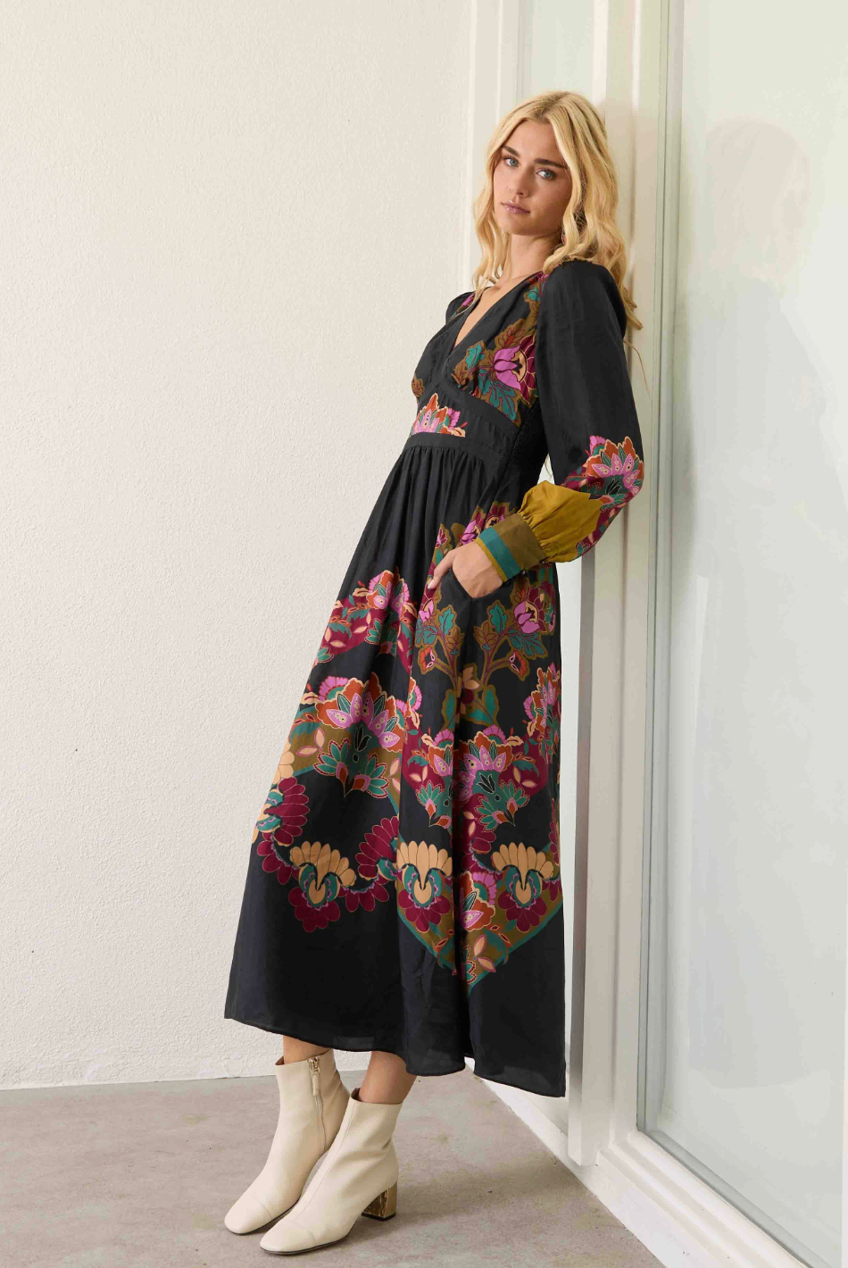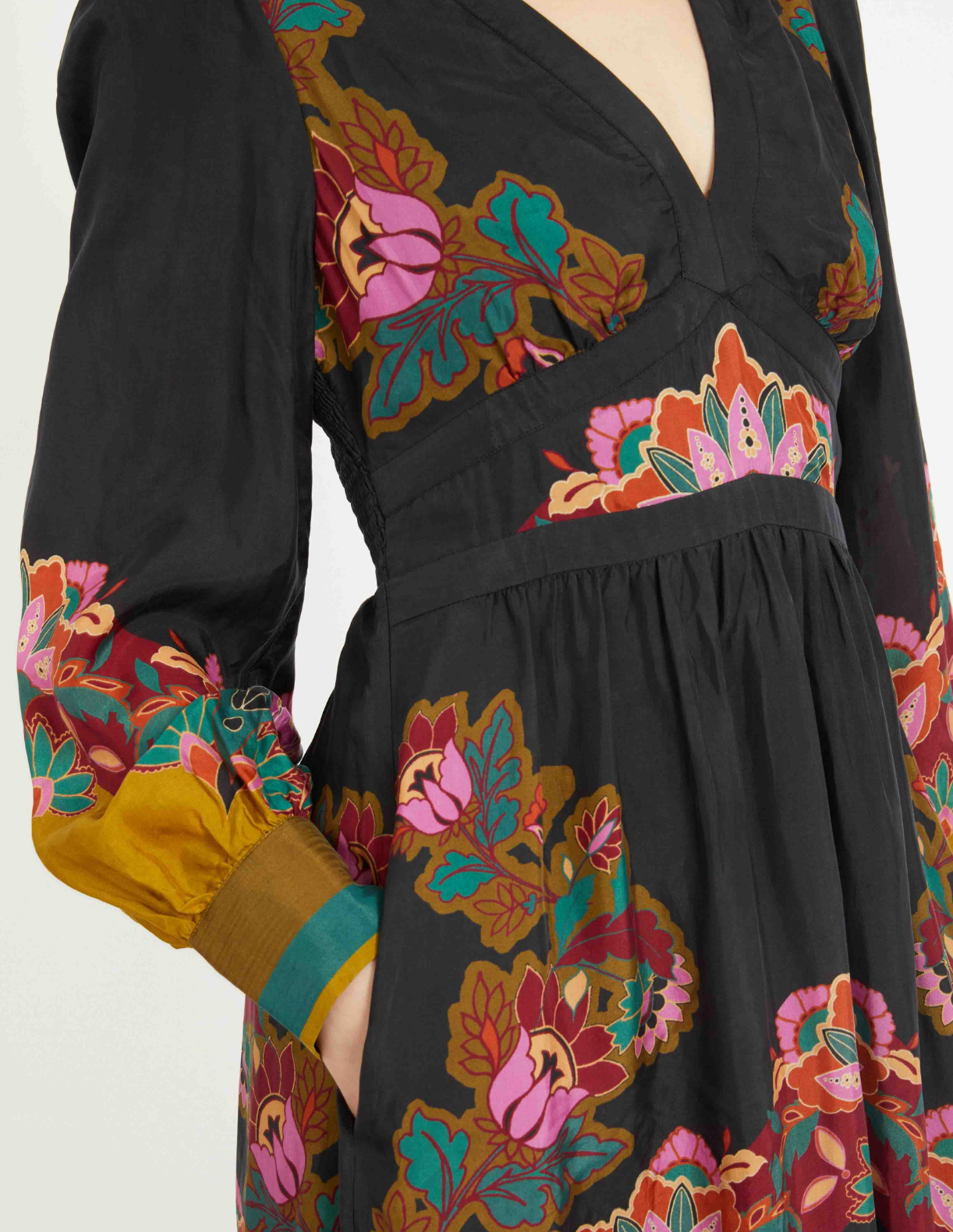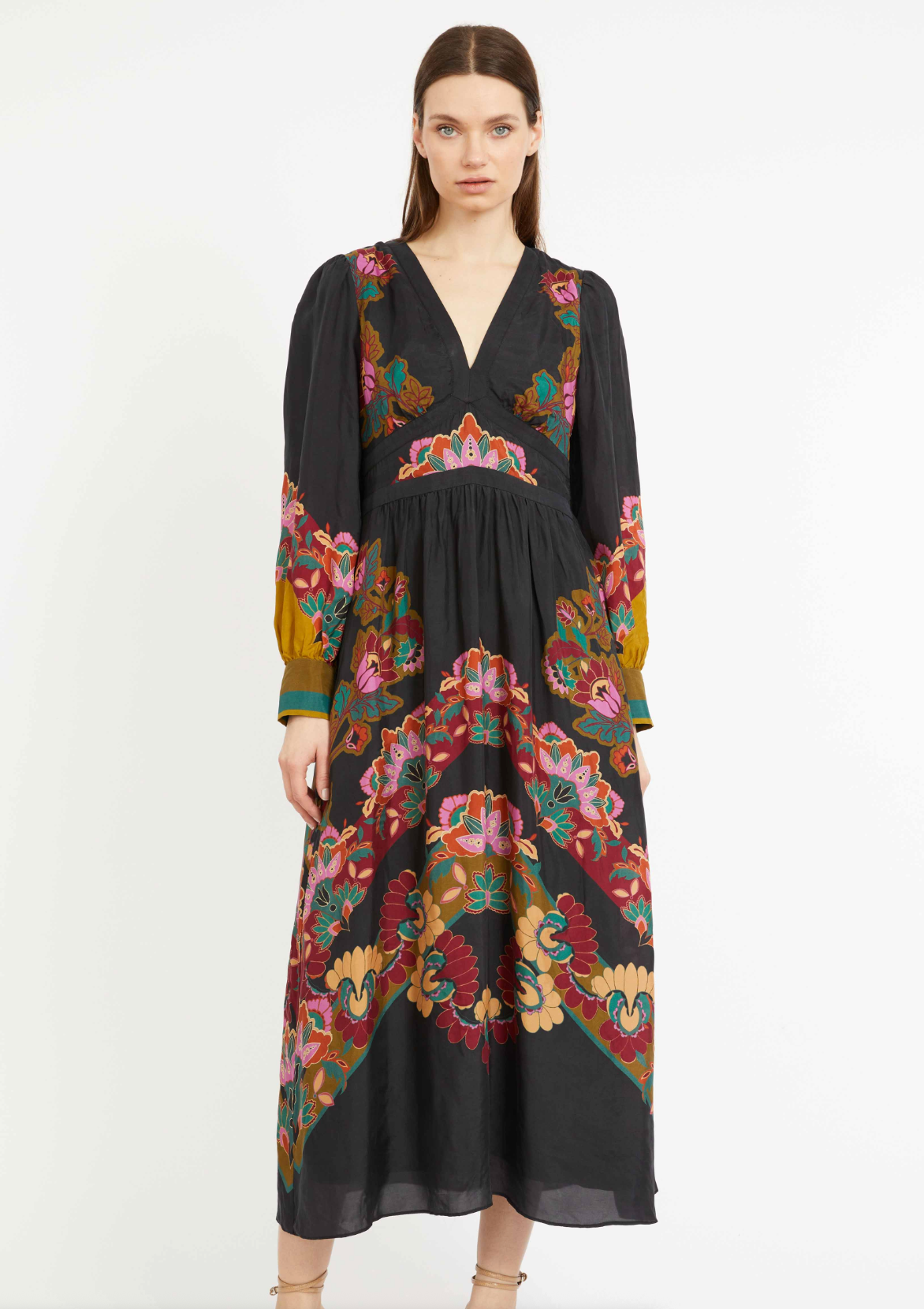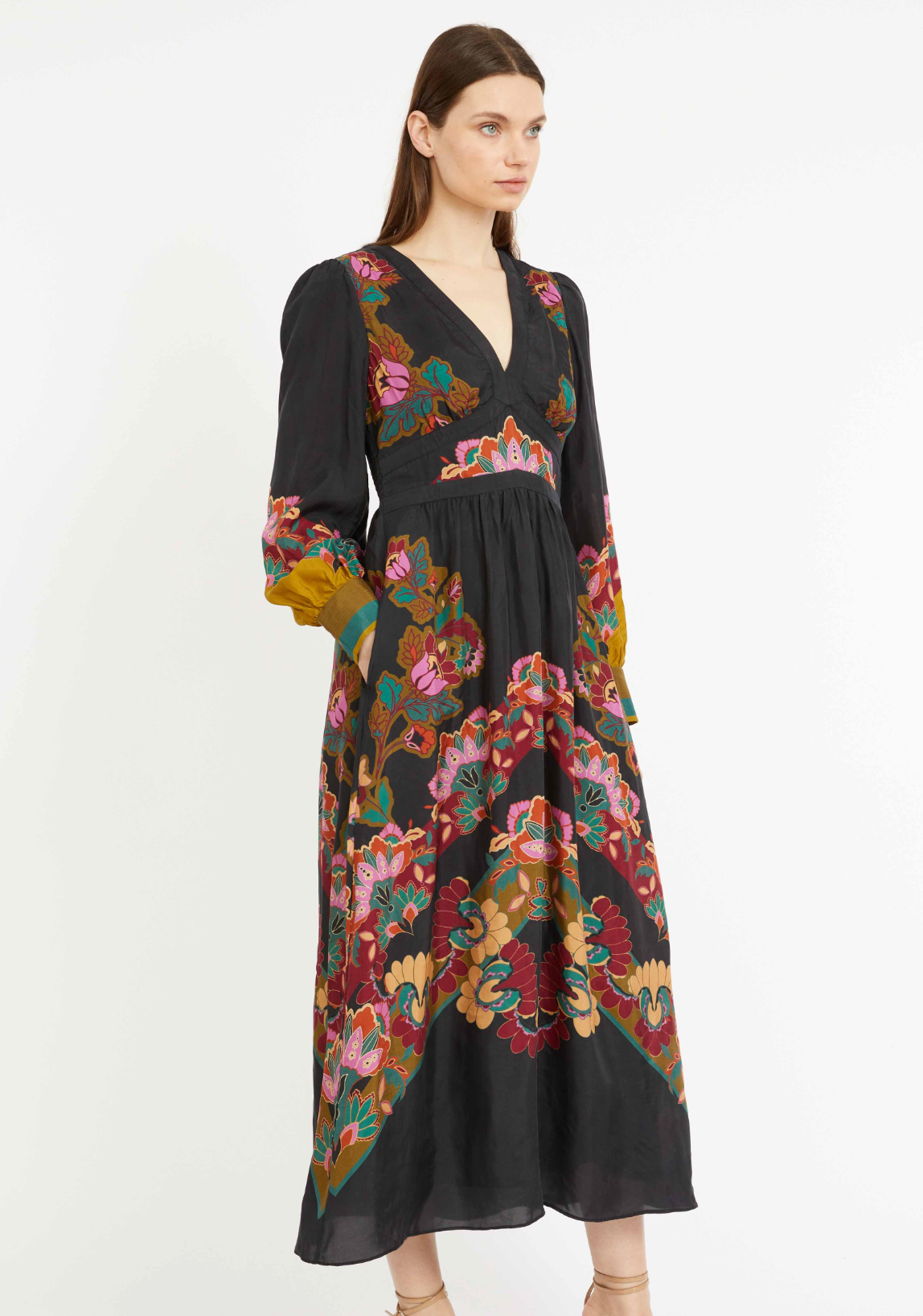Crafted in our Lacquer Bush Lily print, a black background with stylized lilies in warm rust, coral, cream, and burgundy, balanced with deep teal and olive. Decorative borders and blouson sleeves complete the look, perfect for special occasions or evening events.