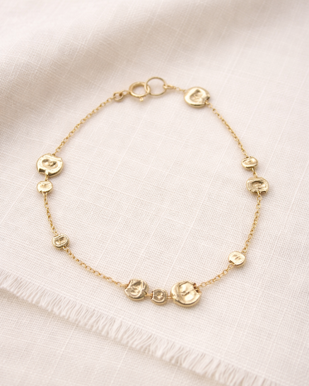 This bracelet is made with hammered gold filled beads along a gold filled chain.