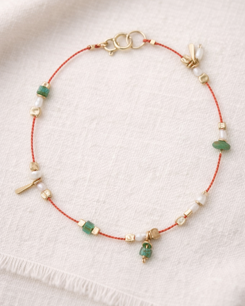 This bracelet is hand-strung on a silk cord and layered with freshwater pearls, Arizona Turquoise Bracelet, and gold filled detailing. The combination feels fresh yet timeless — a subtle nod to coastal palettes with a touch of vintage charm.