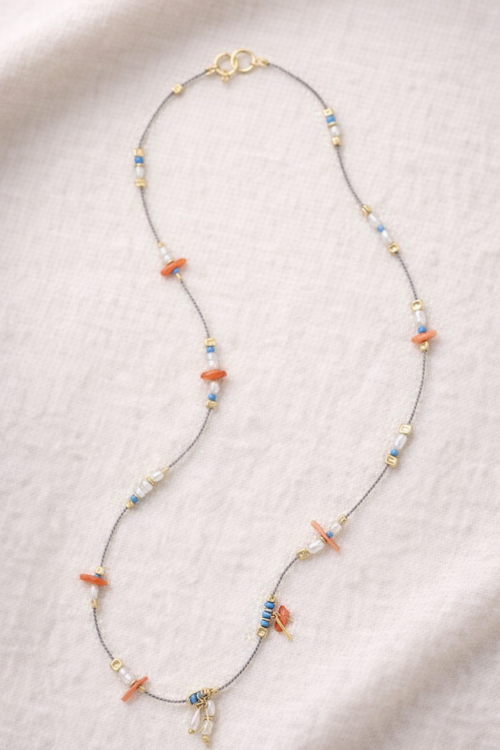 A simple statement necklace made with freshwater pearls, coral chips, and gold filled detailing all along a silk cord.
