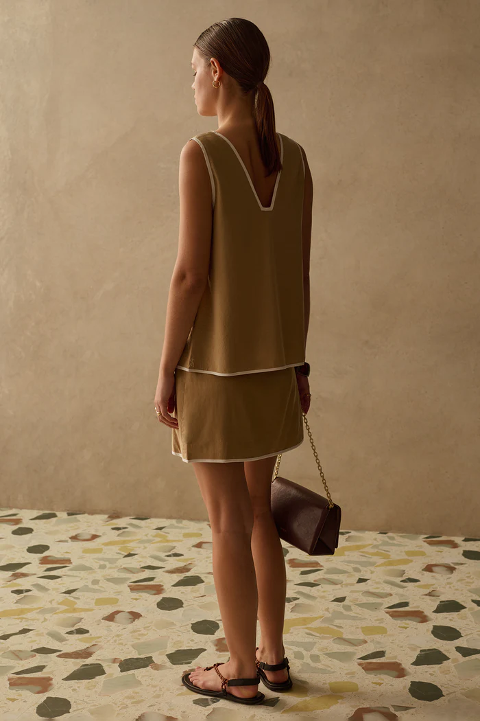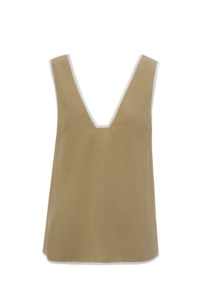 The Winona Top is the essential breezy dressed-up tank style that you’ll be wearing all summer long. The v-neckline features contrast details to accentuate the silhouette. Style as a matching pair with our matching bottom styles for a complete look.