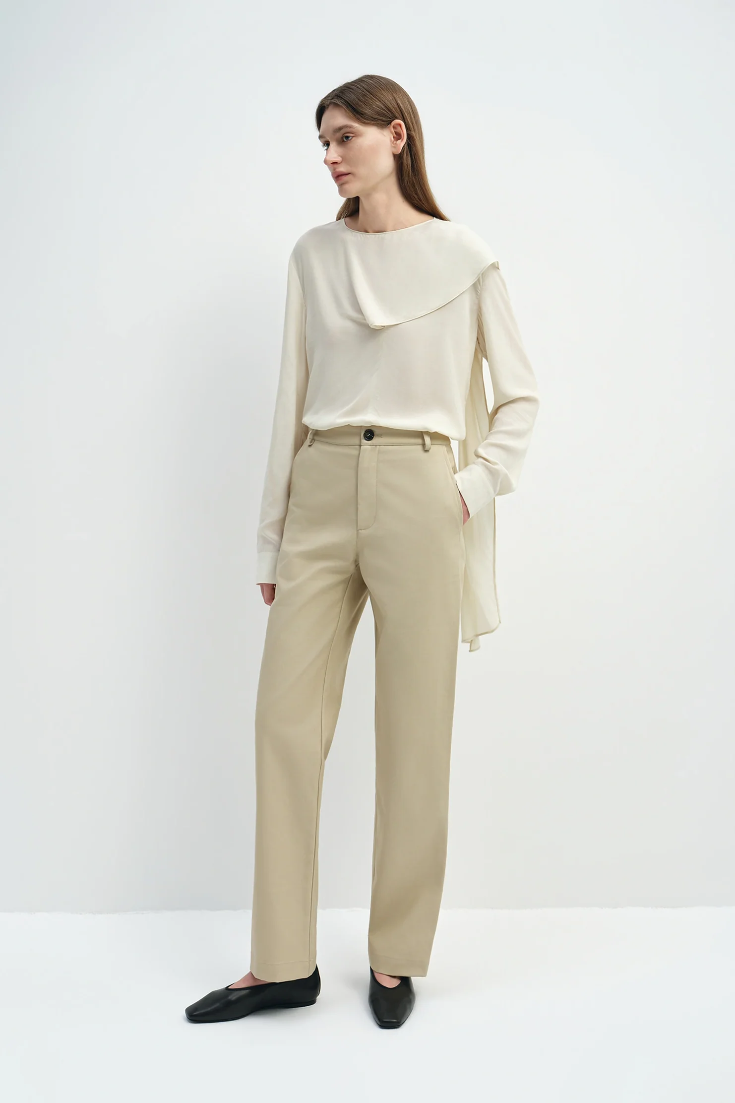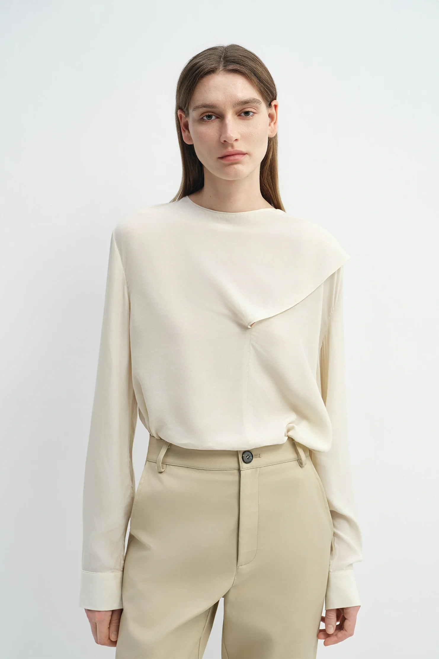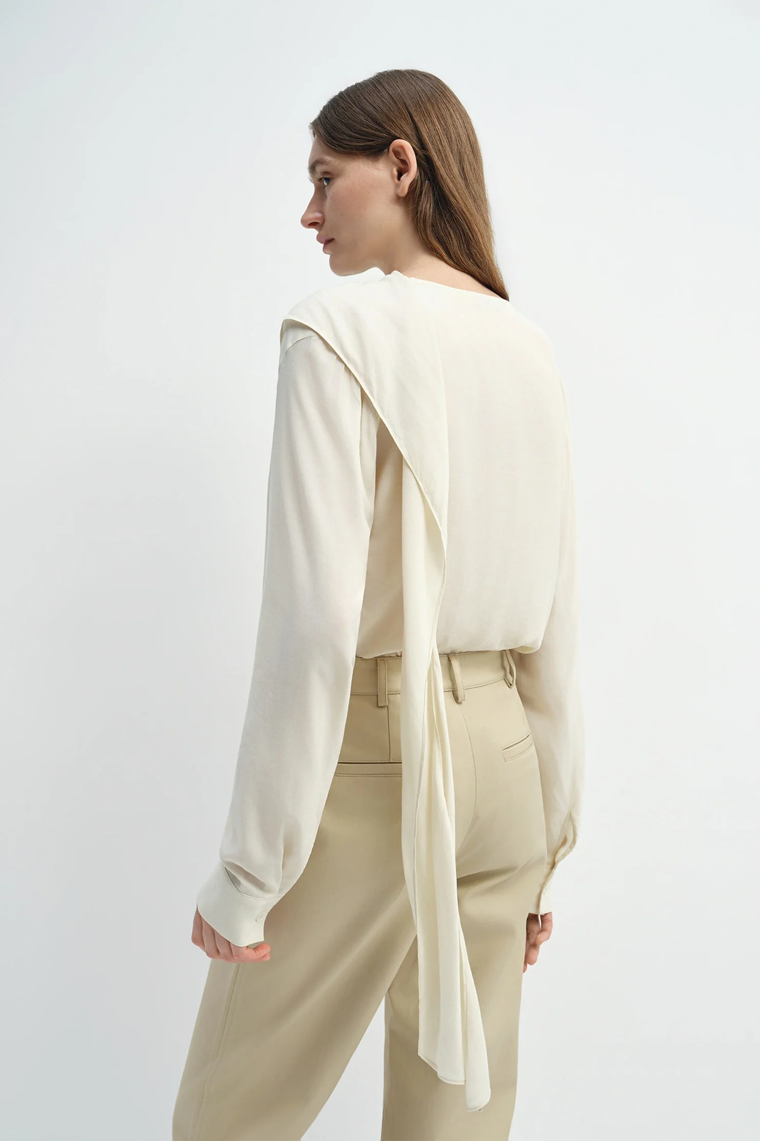 A fluid wrap-style top featuring a scarf neckline that drapes softly, adding dimension and elegance to a streamlined silhouette.
