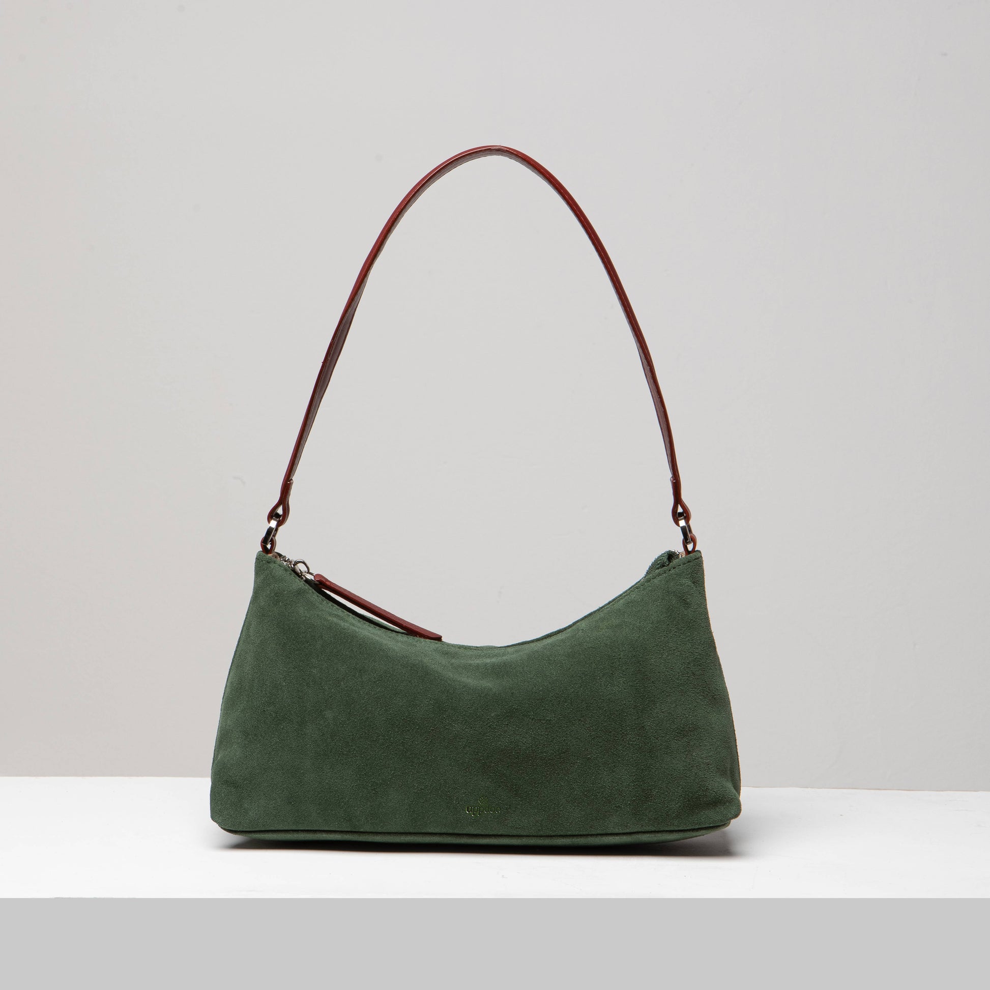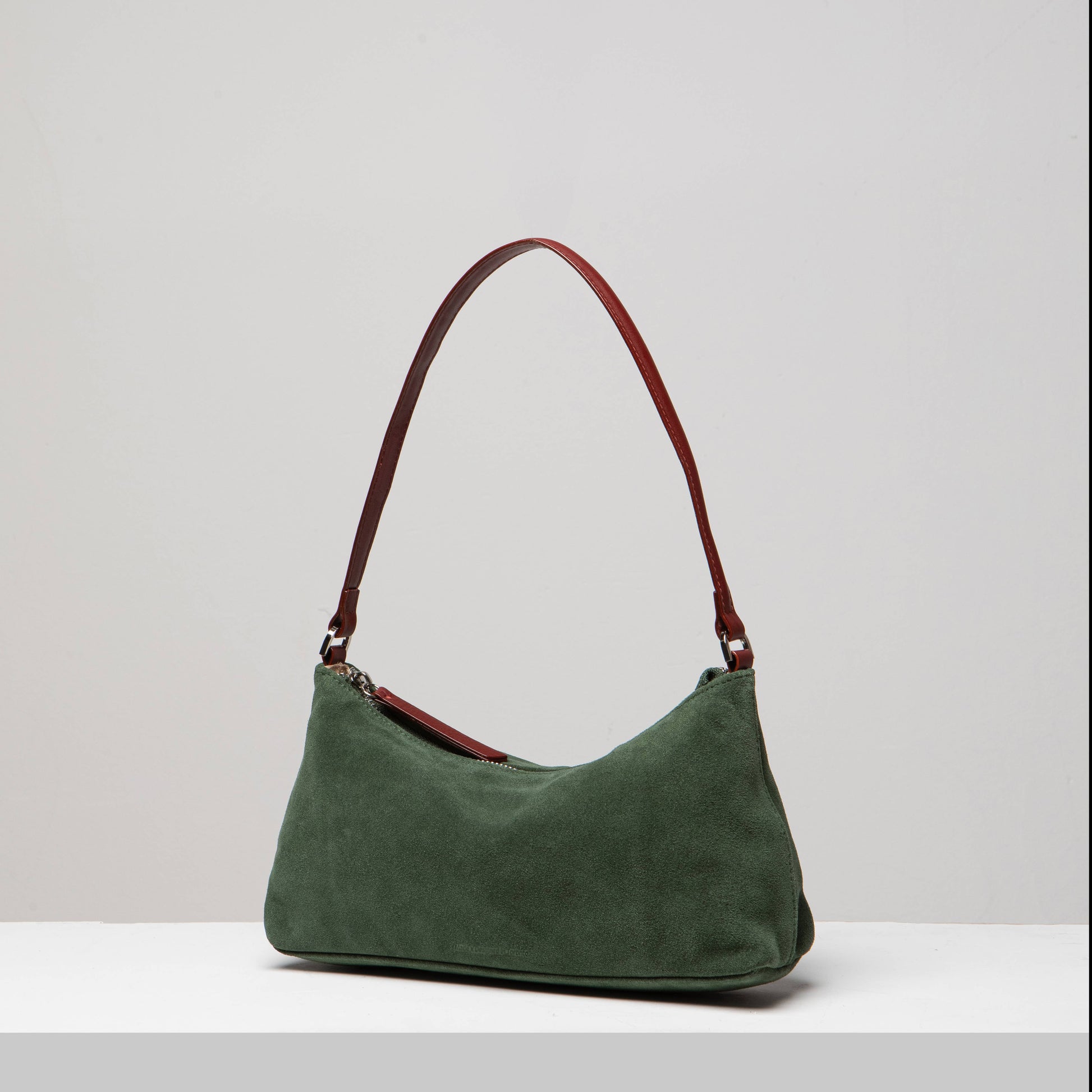 The 'Crescent' Suede Shoulder Bag is crafted from premium genuine suede for a luxe feel and complemented by a sturdy leather top handle for an added touch of elegance. Inspired by retro flair, the sleek silhouette, and smooth suede texture exude a refined yet relaxed vibe, while the leather handle provides durability and comfort for easy carrying. Whether you're dressing up for a night out or adding a chic touch to your everyday look, this bag is a must-have for those who appreciate quality and style.