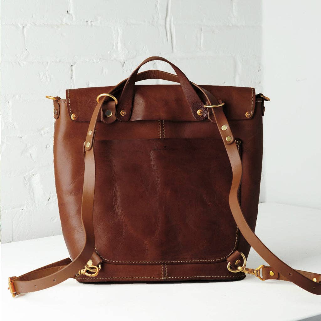 Venture Convertible Backpack features rustic hand-interwoven construction with luxurious full-grain hand-dyed Italian Vachetta leather. Functional and vintage-inspired design stands out from the crowd. The convertible straps is a soon-to-be everyday essential that can transform into a shoulder bag or backpack by a simple pulling action. The leather will age beautifully to show a one of a kind ownership with time and use! Antique finished solid brass hardware highlights all the small fine details on the bag. This design is created on a desire to move away from trends and create practical, unique and timeless pieces.