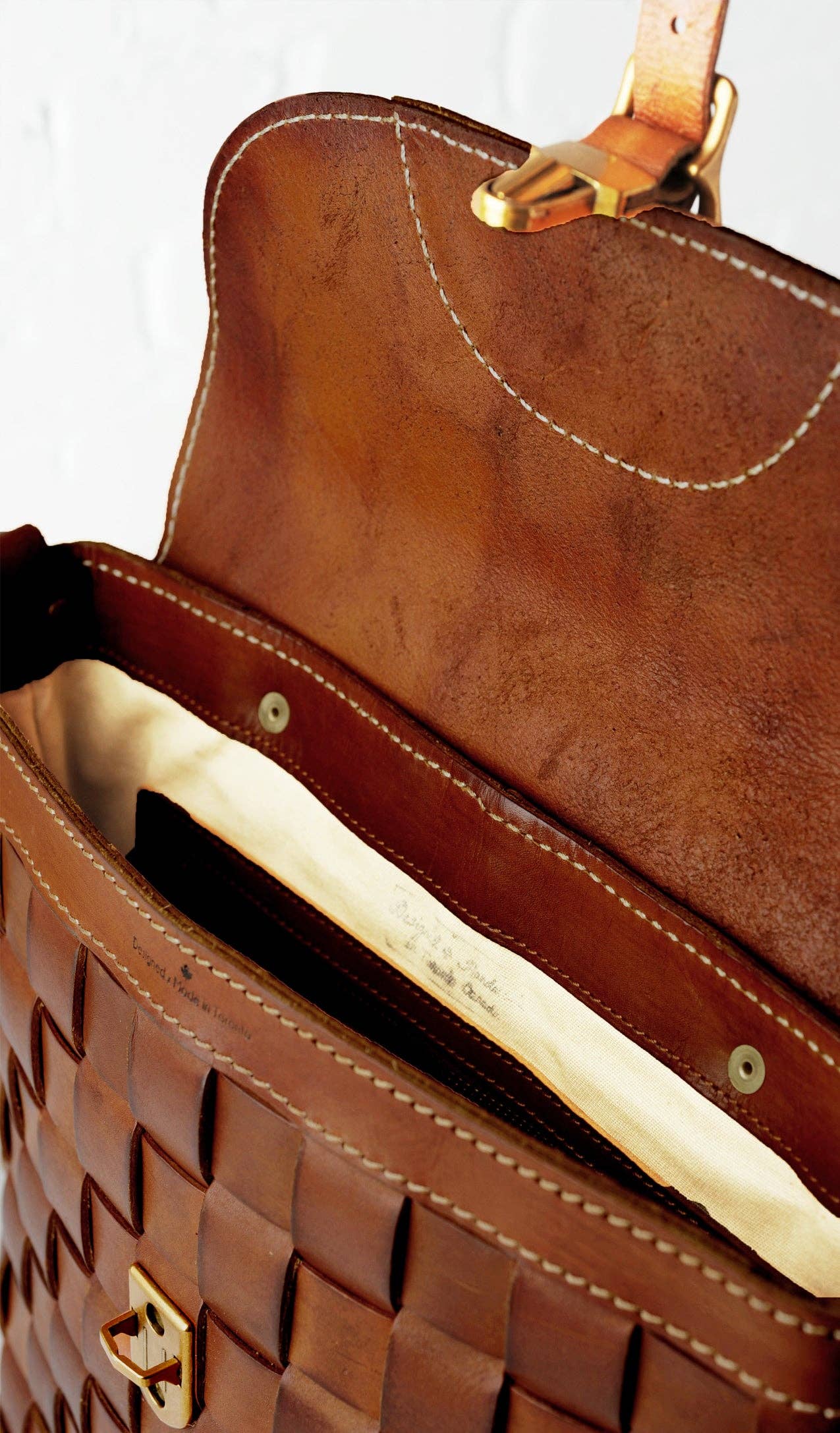Italian Vachetta leather Built-in lining with inner zipped pockets Solid Japanese brass hardware with a vintage finish